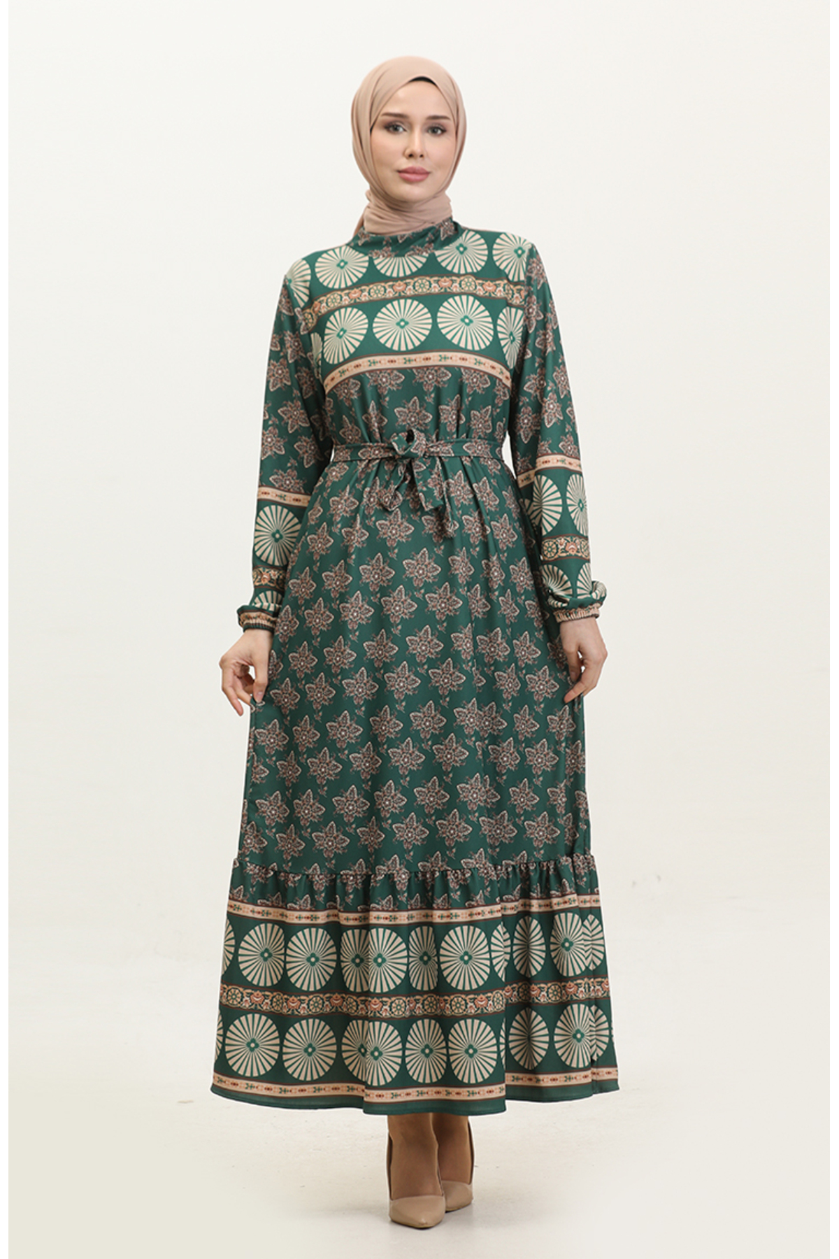 ميزات فستان ربيعي منقوش باللون الأخضر الزمردي - 0366-03 من sefamerve
