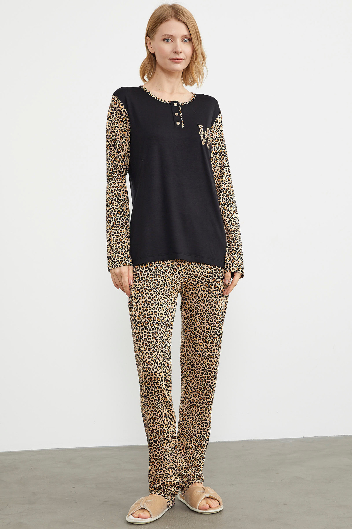 ميزات طقم بيجامة بياقة بأزرار على شكل جلد الفهد - أسود من Sementa