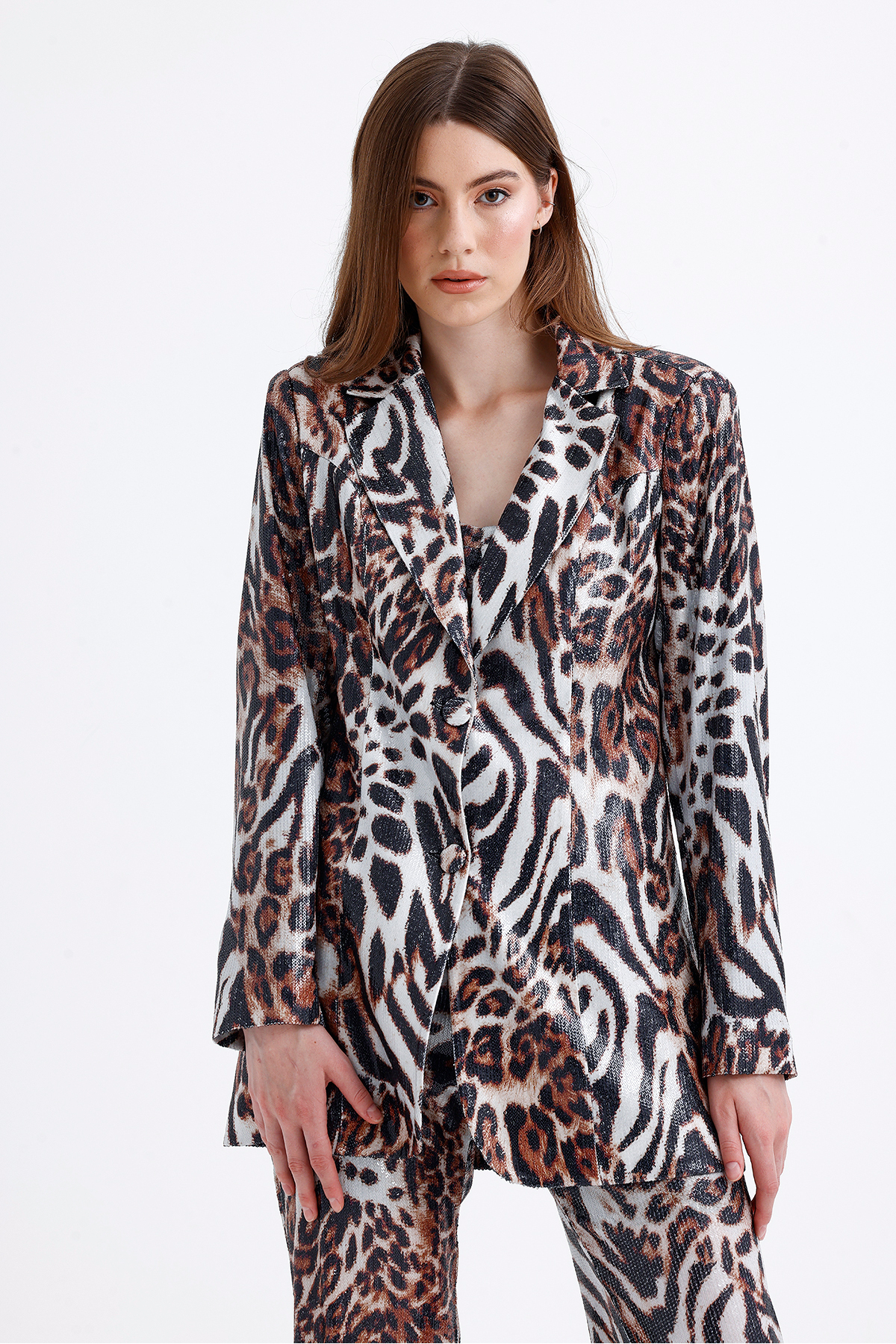 ميزات فستان سهرة منقوش مبطن من الداخل مع سترة مزينة بالترتر | CKT34264 كابلان من Sense