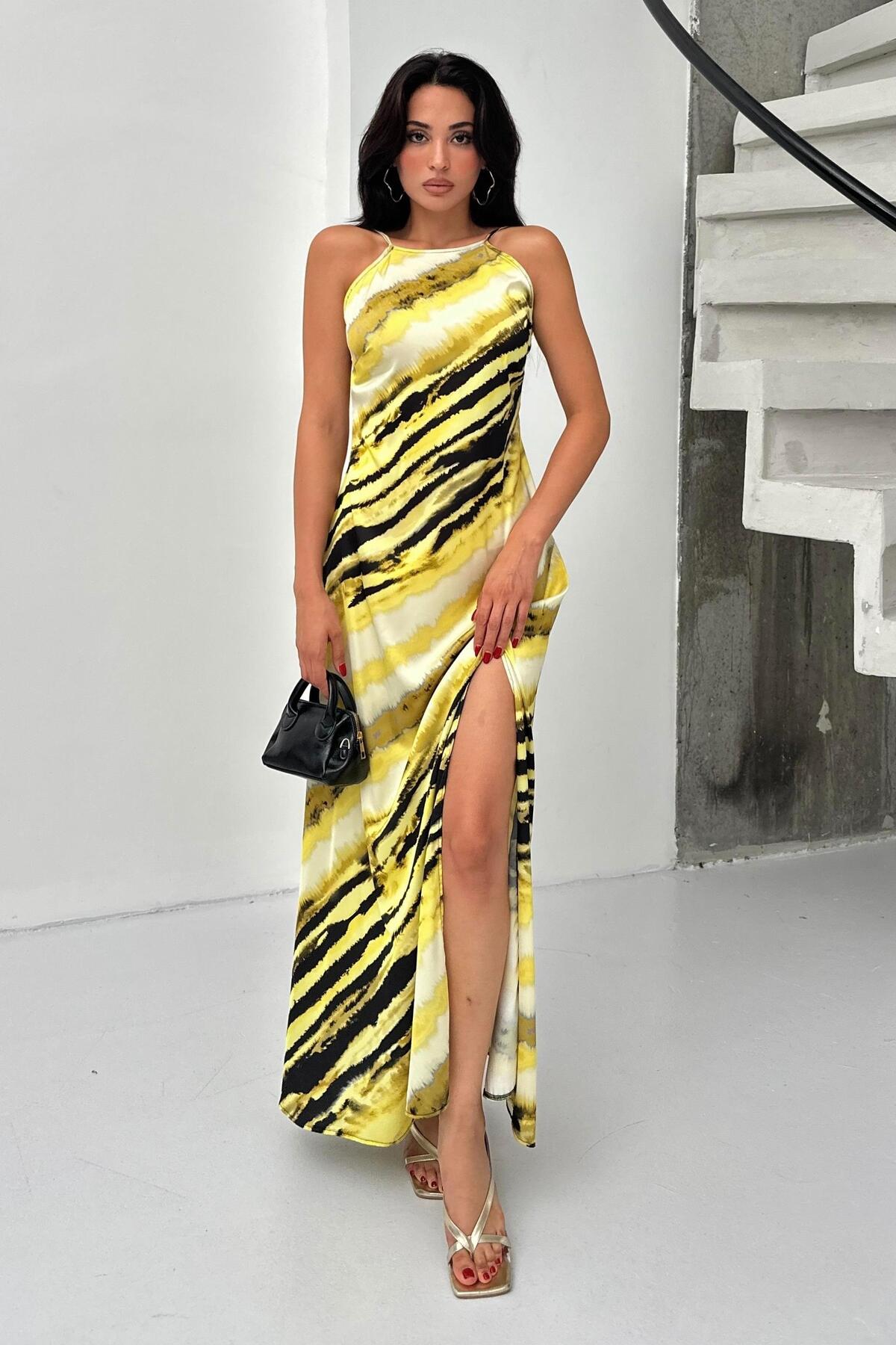 Serica Moda فستان أصفر منقوش بحزام وفتحة