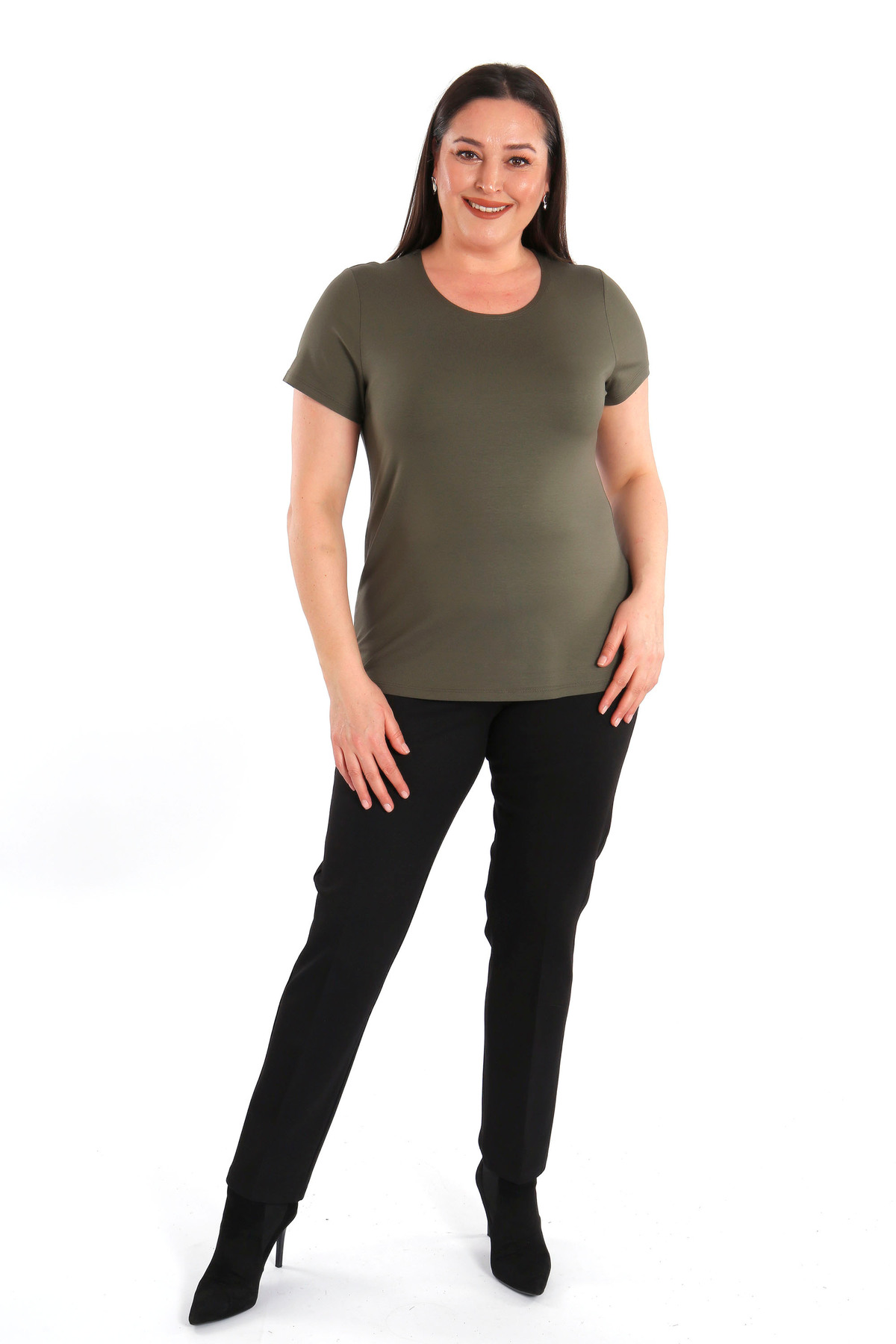 SERTUĞ بلوزة ترين42بلس كبيرة الحجم بياقة دائرية أساسية باللون الكاكي