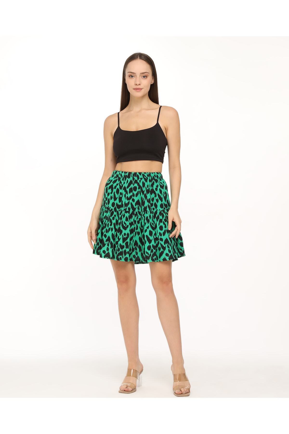 ميزات تنورة قصيرة منقوشة بنقشة الفهد الأخضر من SHE BEST