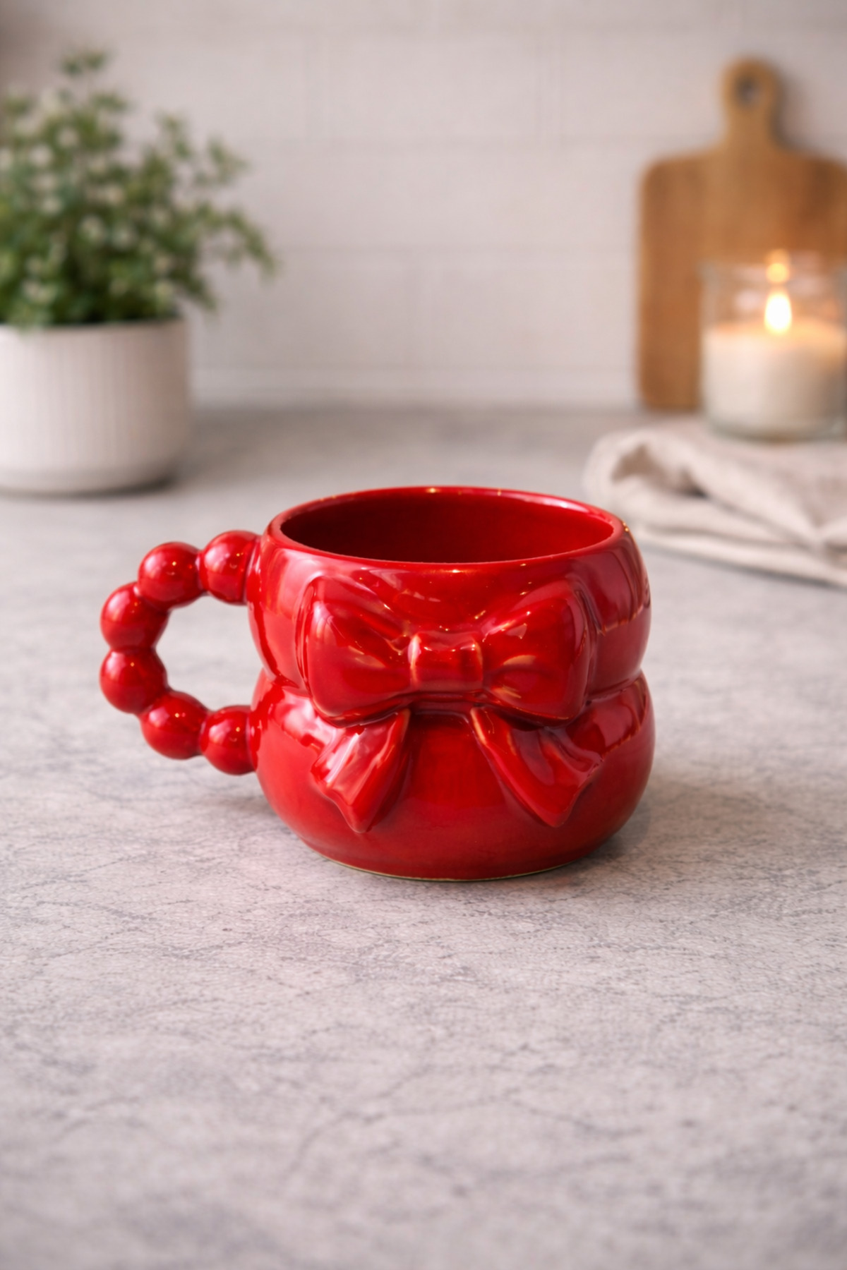 ميزات كوب سيراميك مصنوع يدويًا بالكامل بنقش ثلاثي الأبعاد على شكل فيونكة حمراء مزخرفة بشكل خاص من SırART