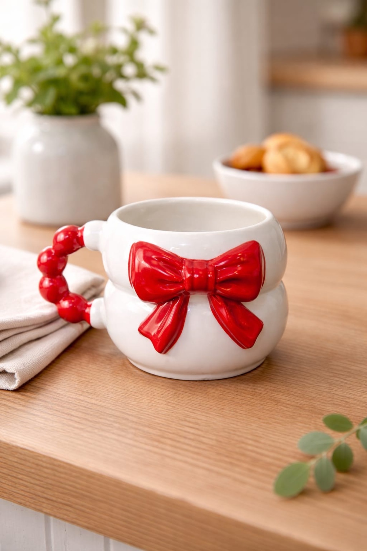 ميزات كوب سيراميك مصنوع يدويًا بالكامل بنمط فيونكة حمراء منقوشة ثلاثية الأبعاد من SırART