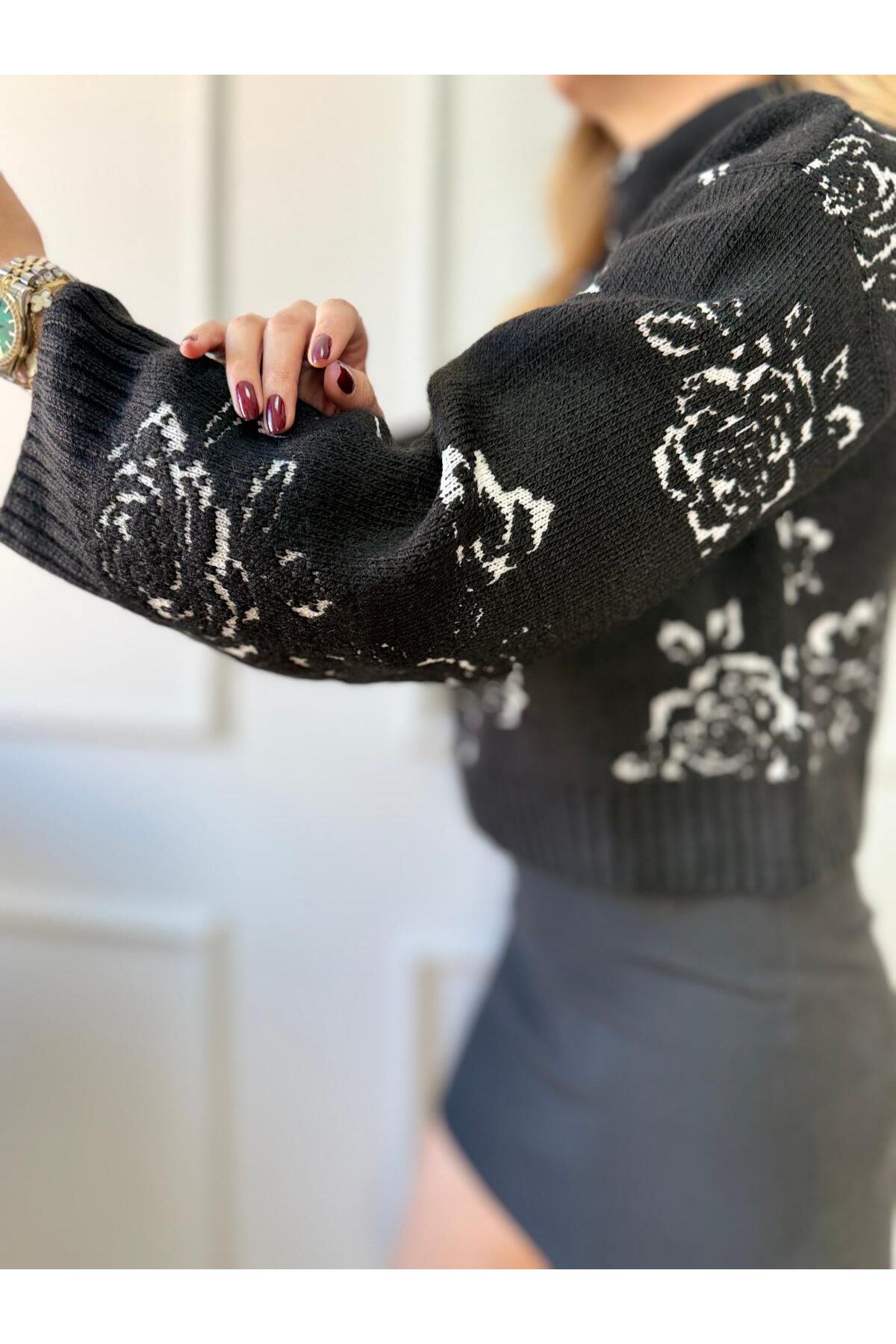 ميزات سترة منقوشة باللون الأسود على شكل وردة من Size Özgü