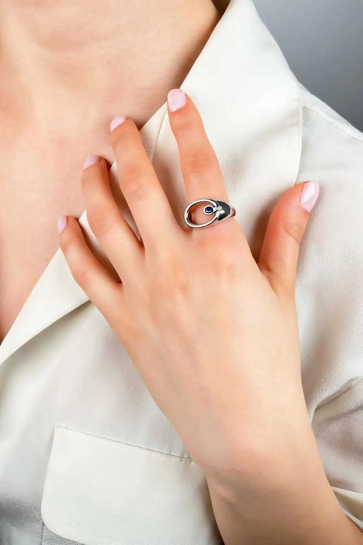 Sose Moda خاتم بيضاوي الشكل مرصع بالأحجار - فضي