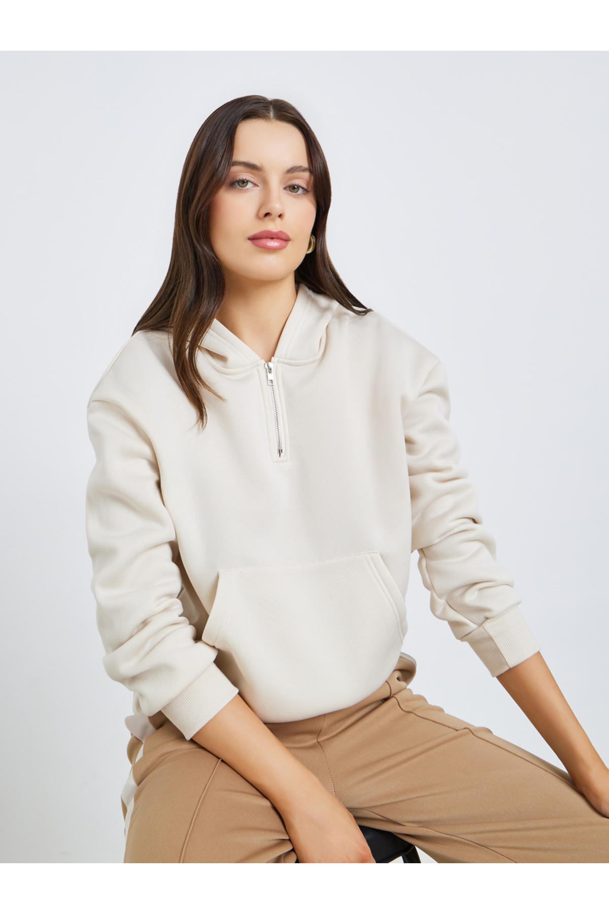 ميزات هودي سادة بسحاب ربع لون بيج من Styli