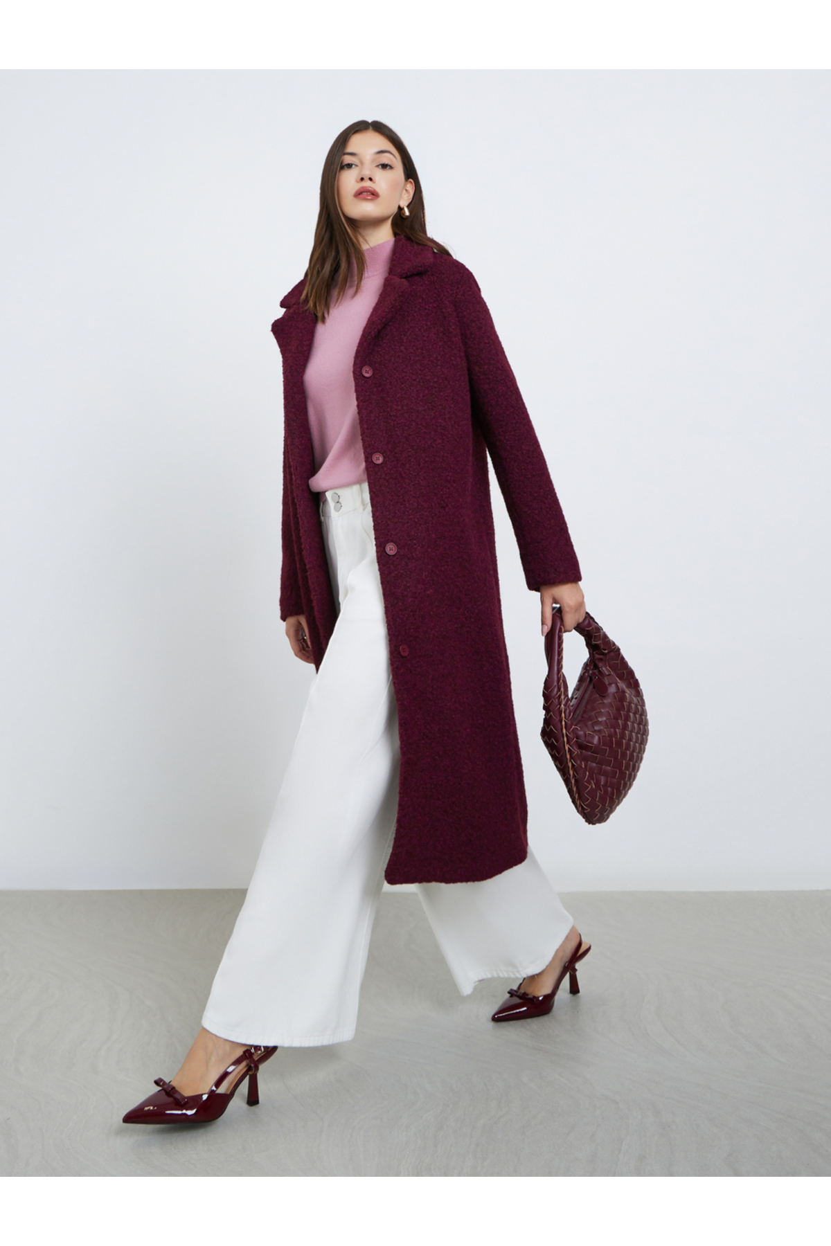 ميزات معطف صوف متوسط الطول بأزرار باللون العنابي من Styli