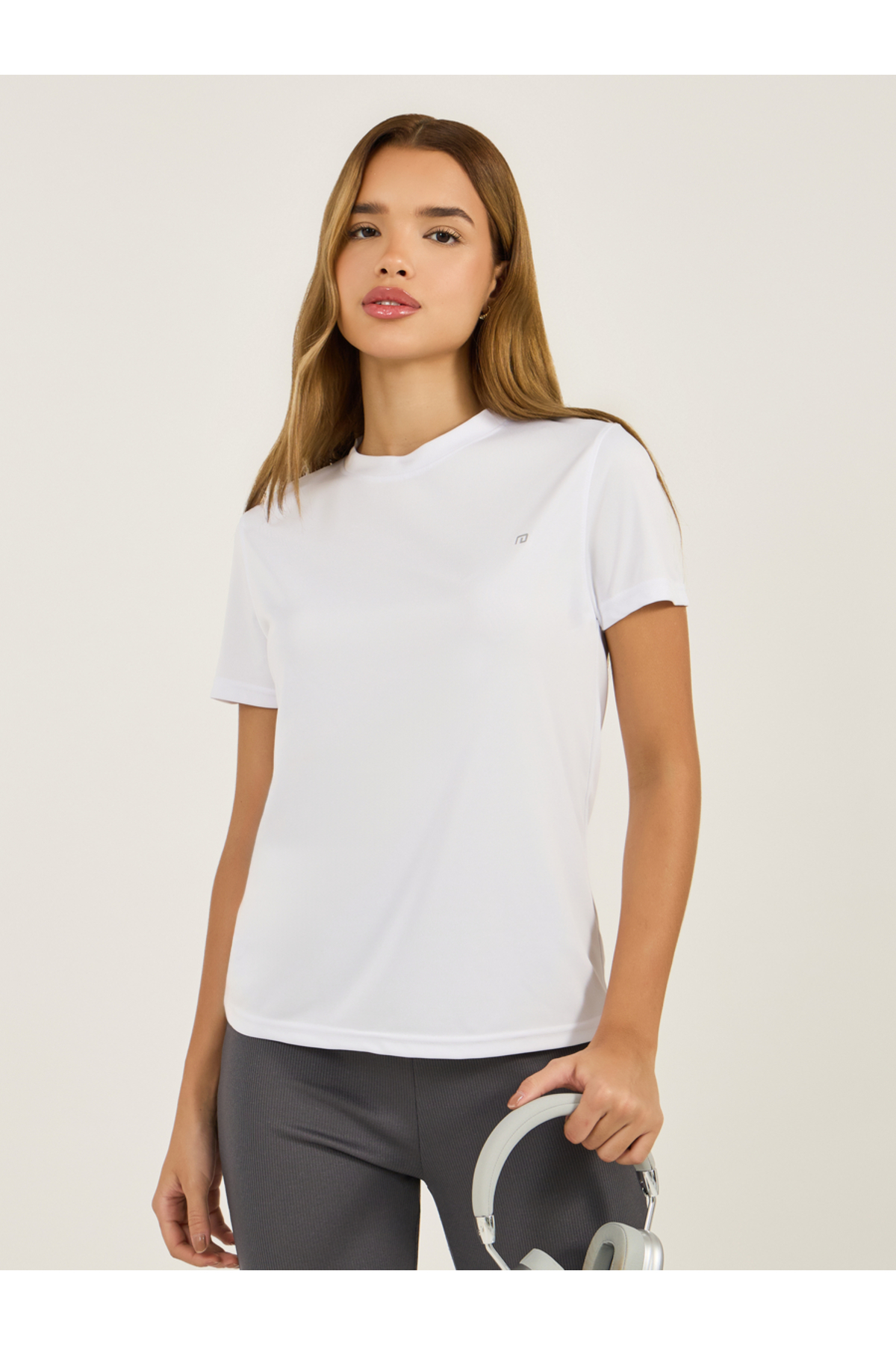 Styli بلوزة أساسية بأكمام قصيرة وياقة مستديرة وشعار