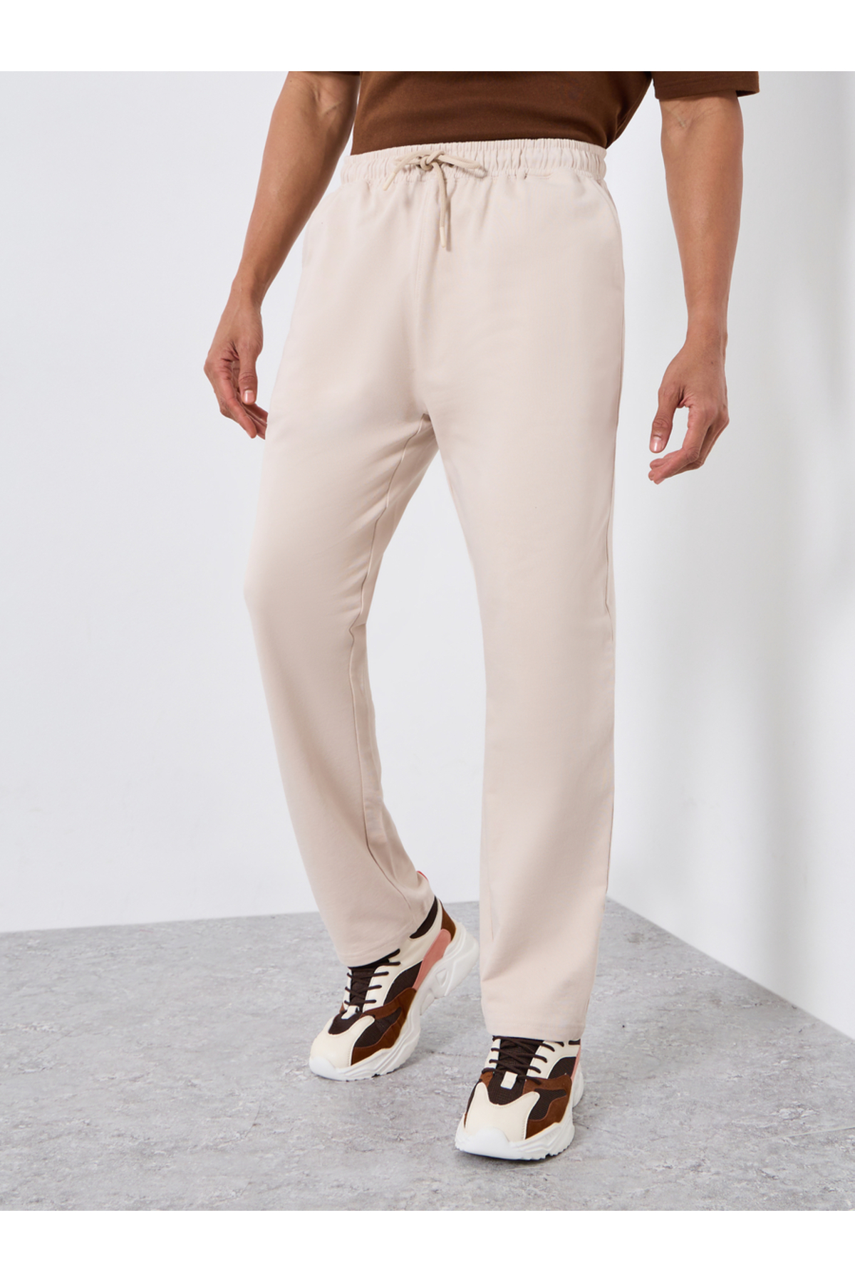 Styli بنطال رياضي رجالي بيج سادة بقصة مستقيمة