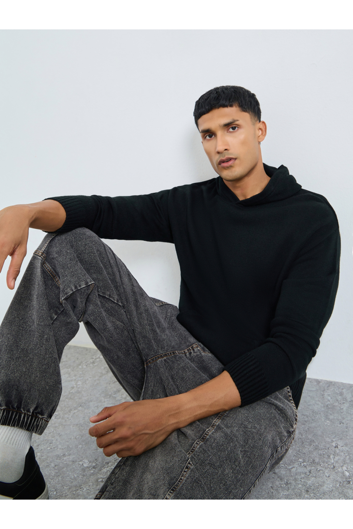ميزات هودي رجالي أسود سادة محبوك من Styli