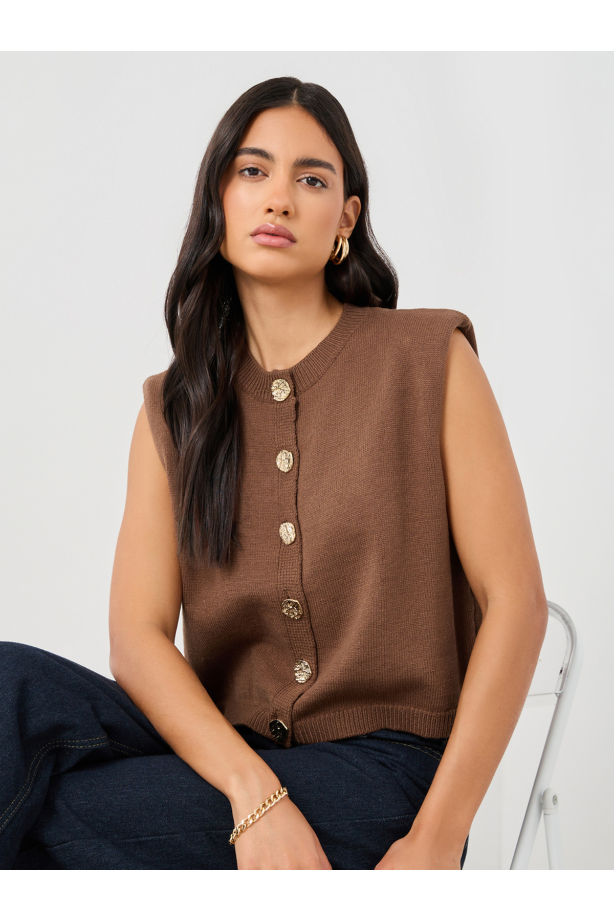ميزات بلوزة سادة بدون أكمام وأزرار مع تفاصيل وسادة الكتف من Styli