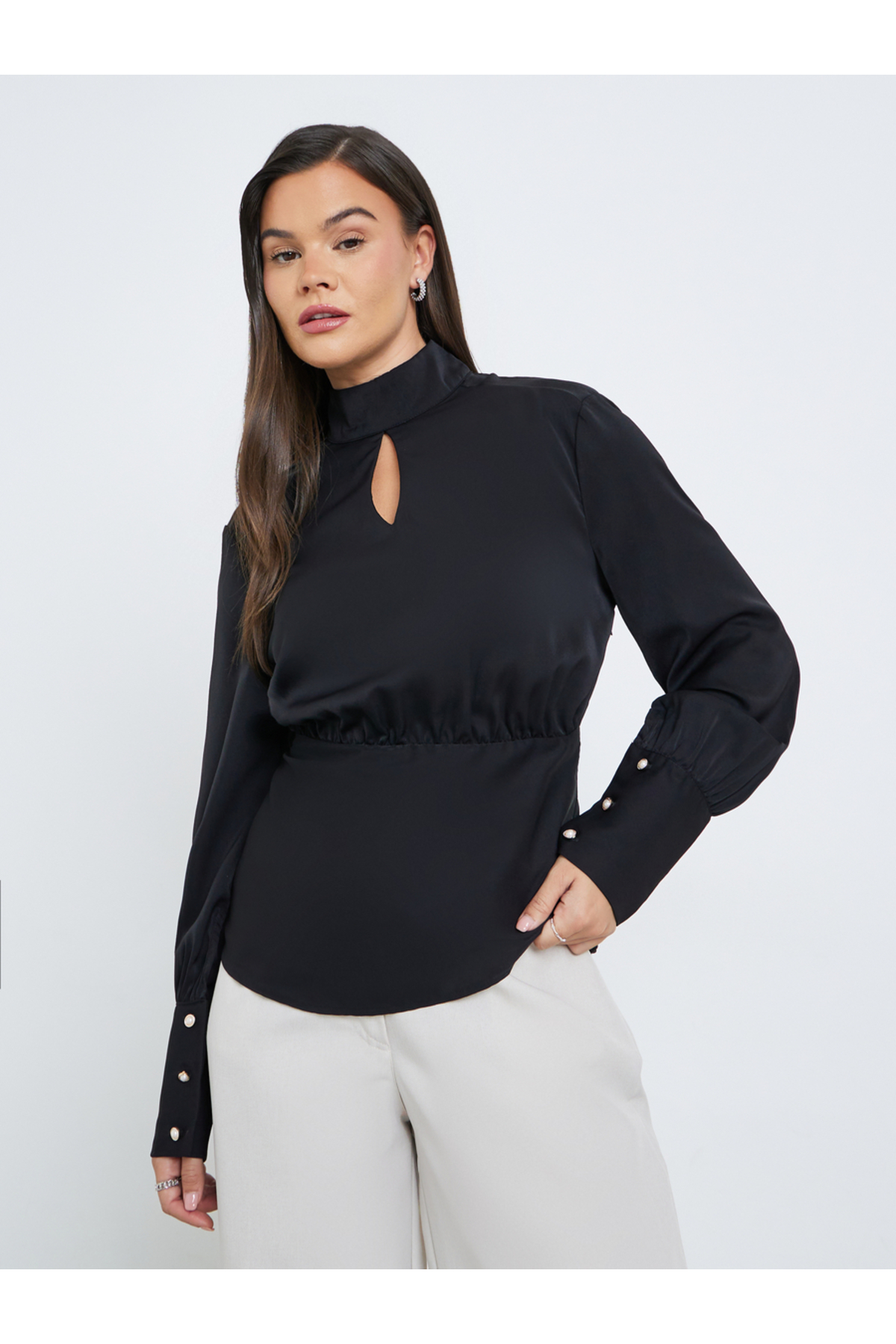 ميزات بلوزة سادة بفتحة رقبة عالية وحافة منحنية من Styli