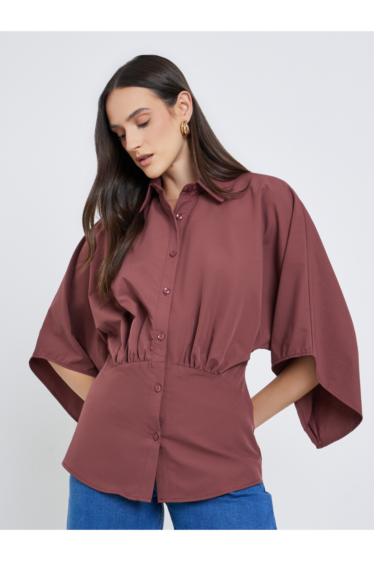 ميزات قميص سادة بأكمام كيمونو وأزرار من Styli