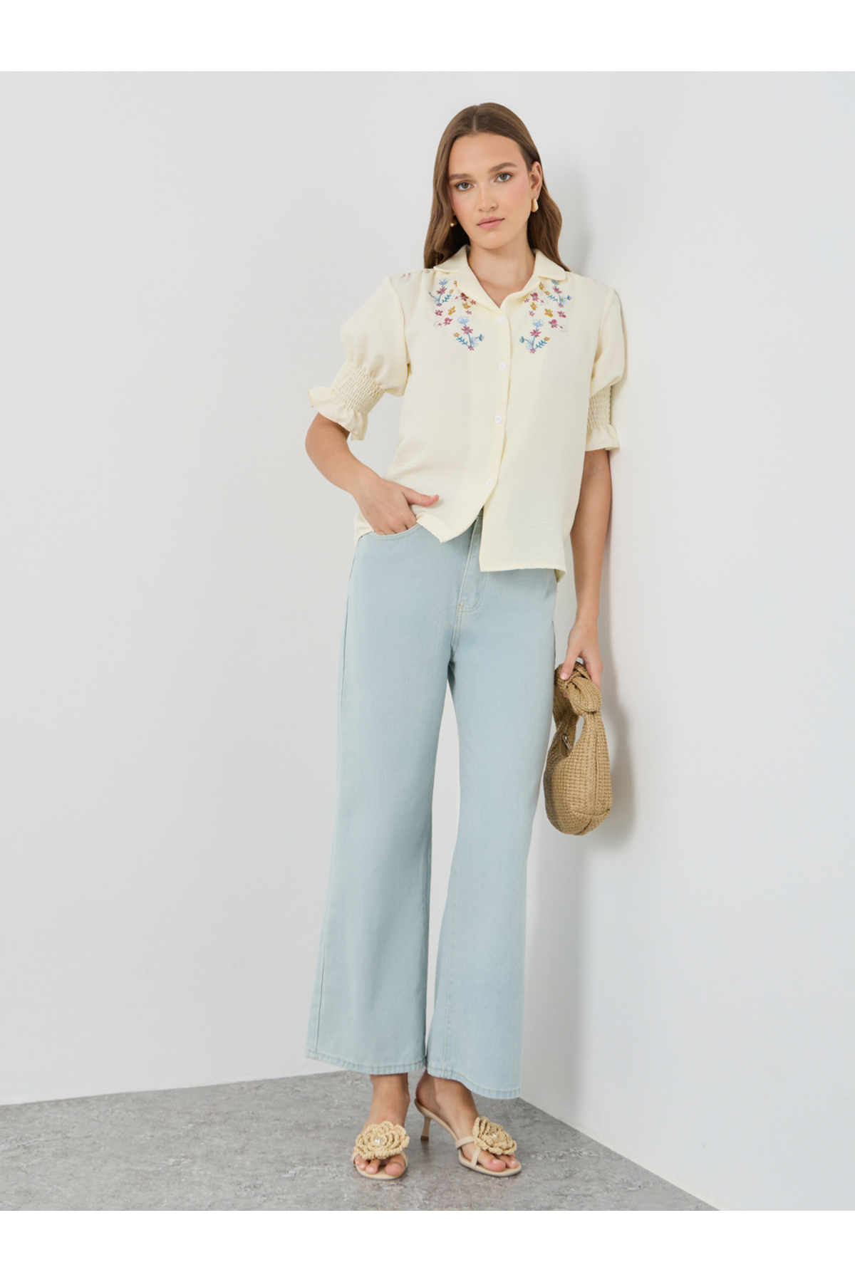 ميزات بنطال جينز سادة متوسط الارتفاع وواسع الساق من Styli