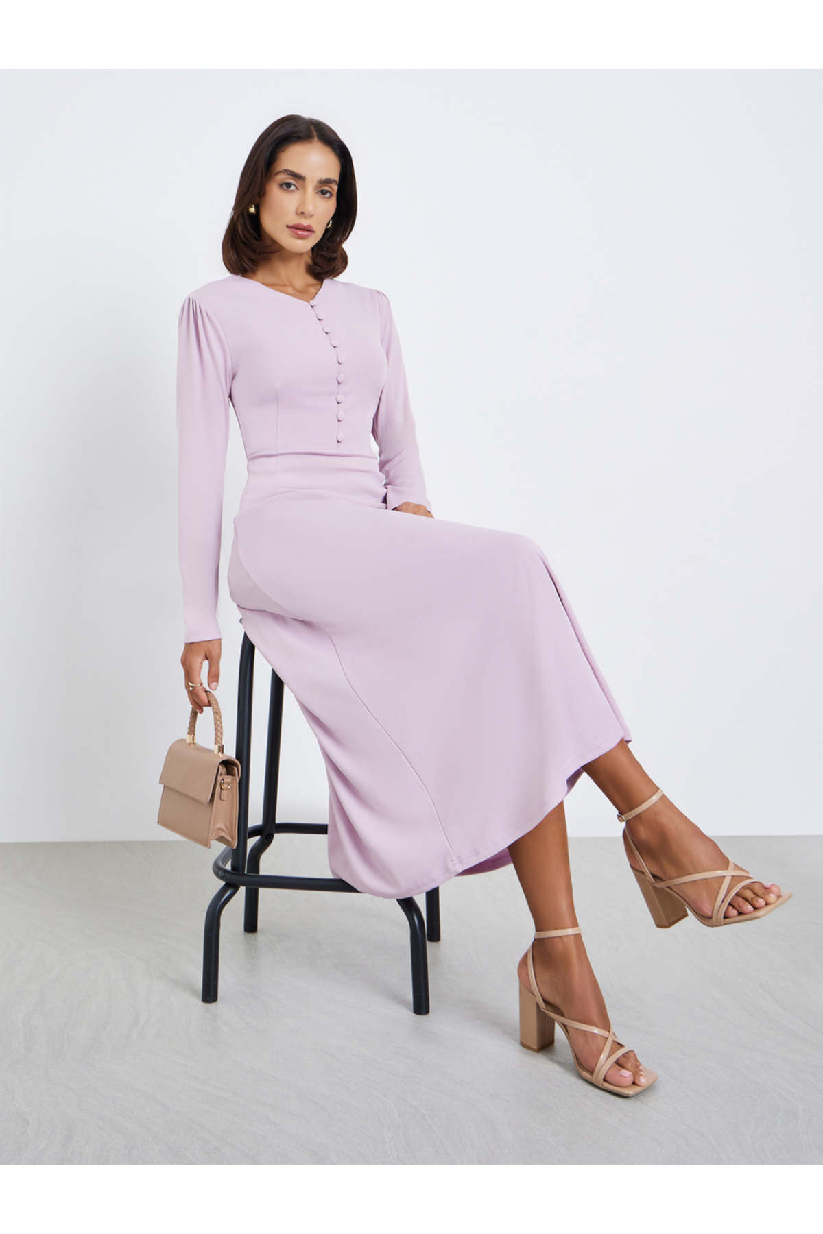 ميزات فستان ماكسي بأكمام منفوخة وأزرار بلون موحد من Styli