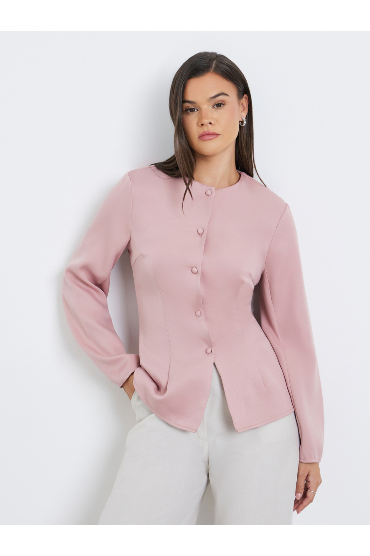 ميزات بلوزة سادة برقبة مستديرة وأزرار من Styli