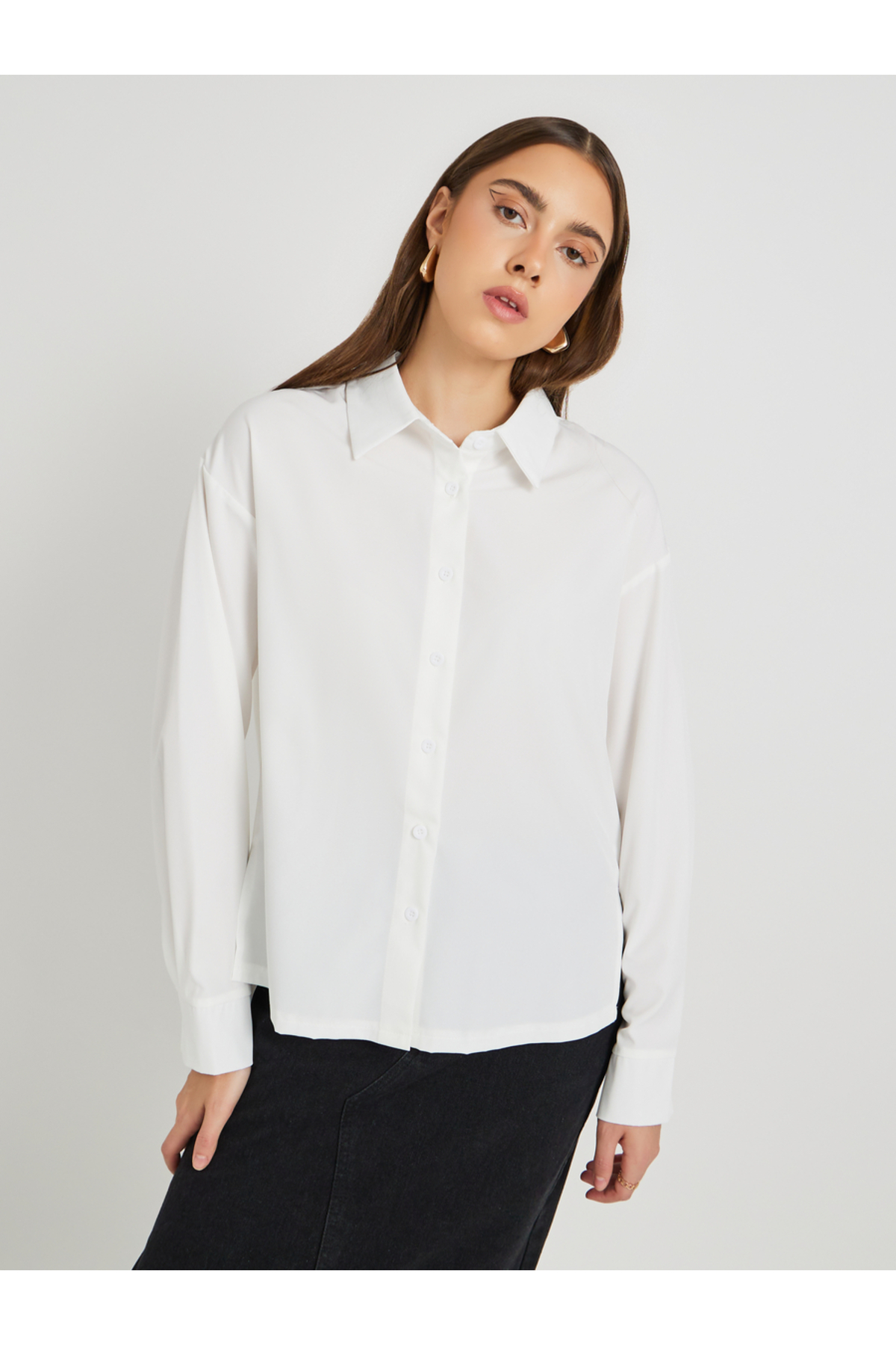 ميزات قميص سادة بأكمام طويلة وياقة واسعة من Styli