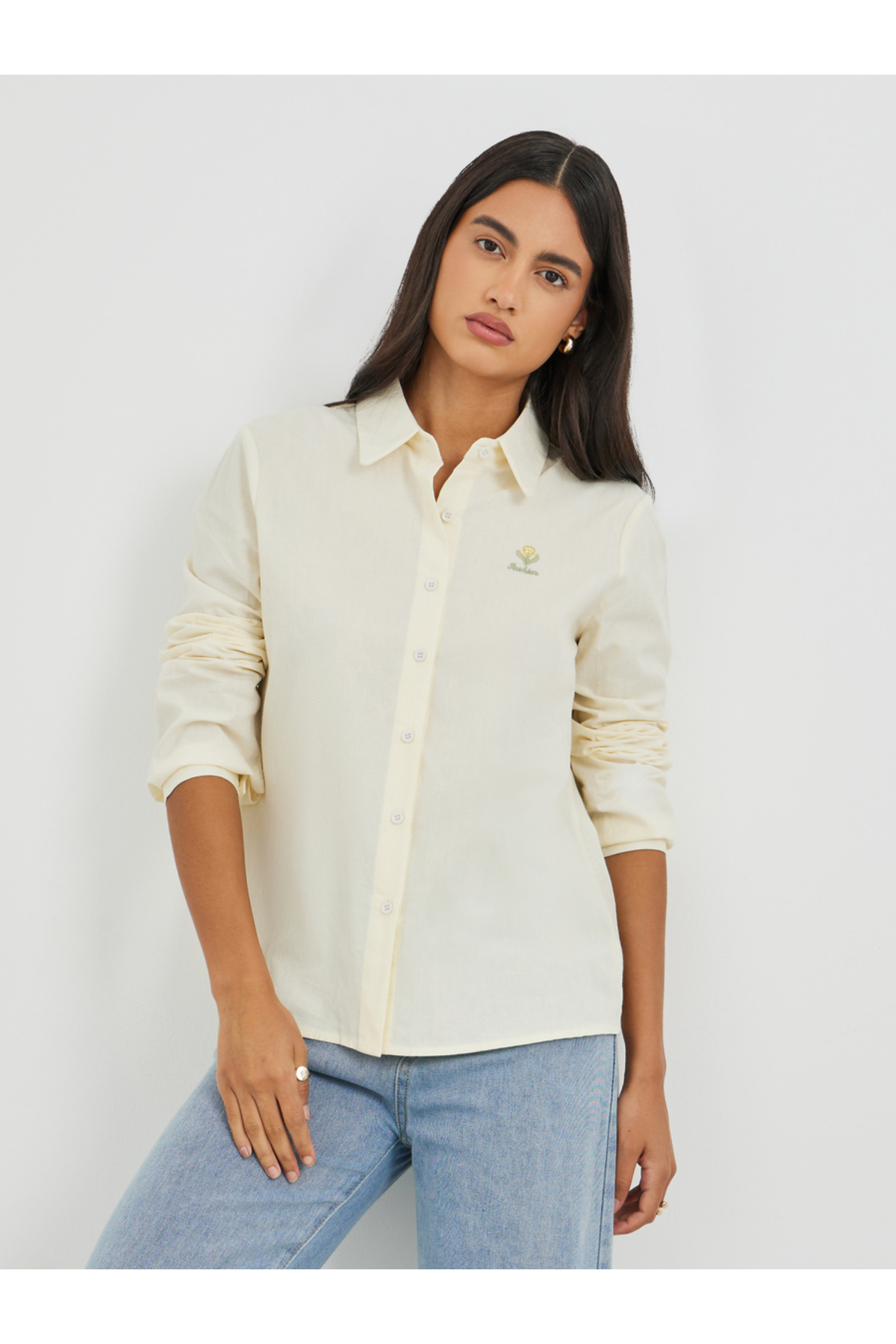 ميزات قميص سادة بأكمام طويلة وياقة واسعة من Styli