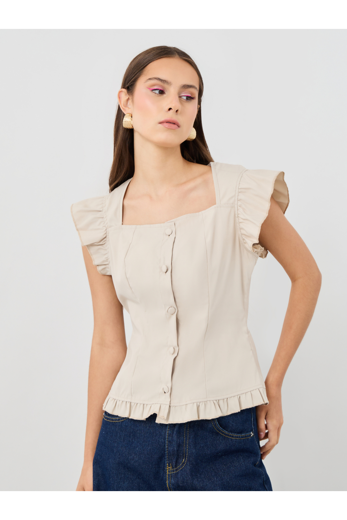 ميزات بلوزة سادة برقبة مربعة وأكمام مكشكشة وأزرار من Styli