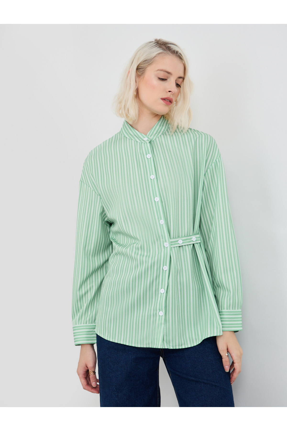 Styli بلوزة مخططة بياقة ماندرين وأزرار