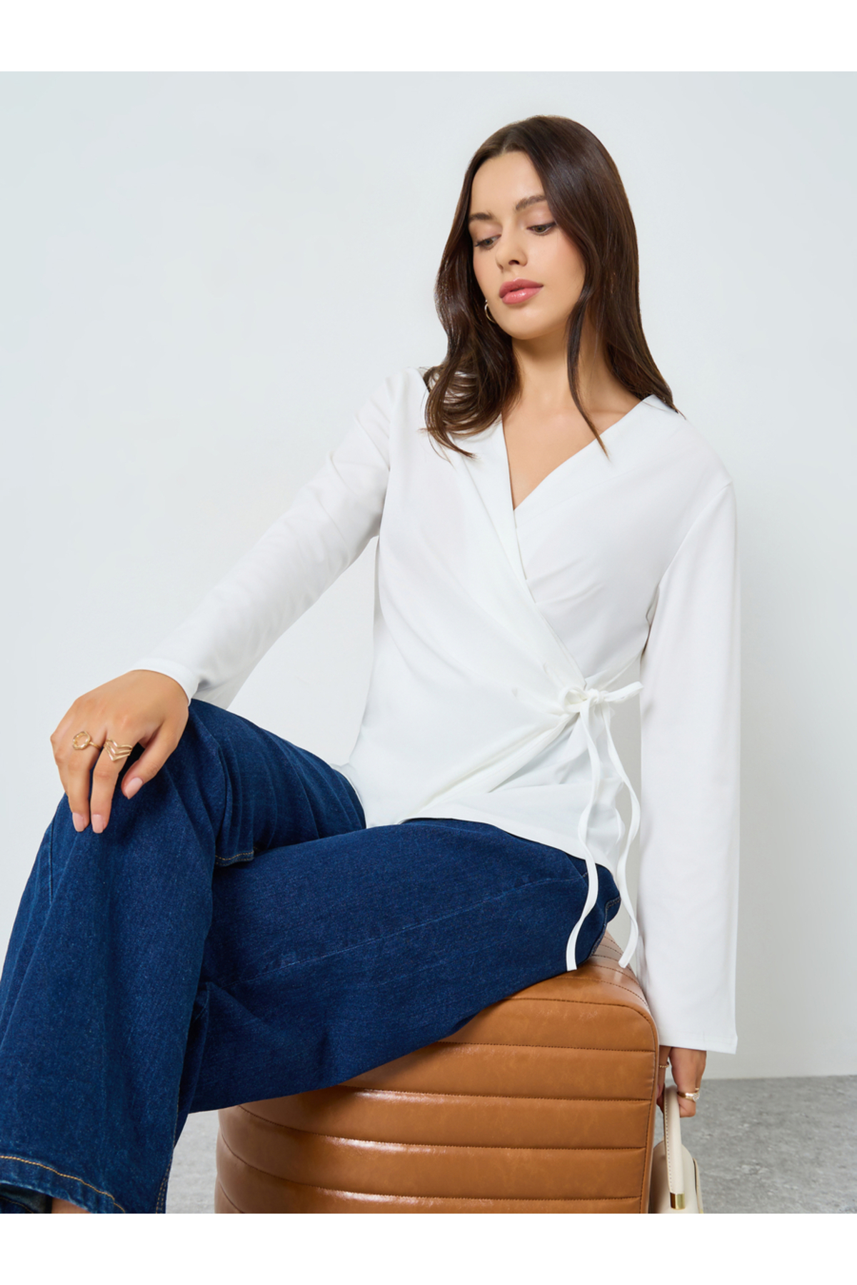 ميزات بلوزة بيضاء سادة بأكمام واسعة ملفوفة من Styli