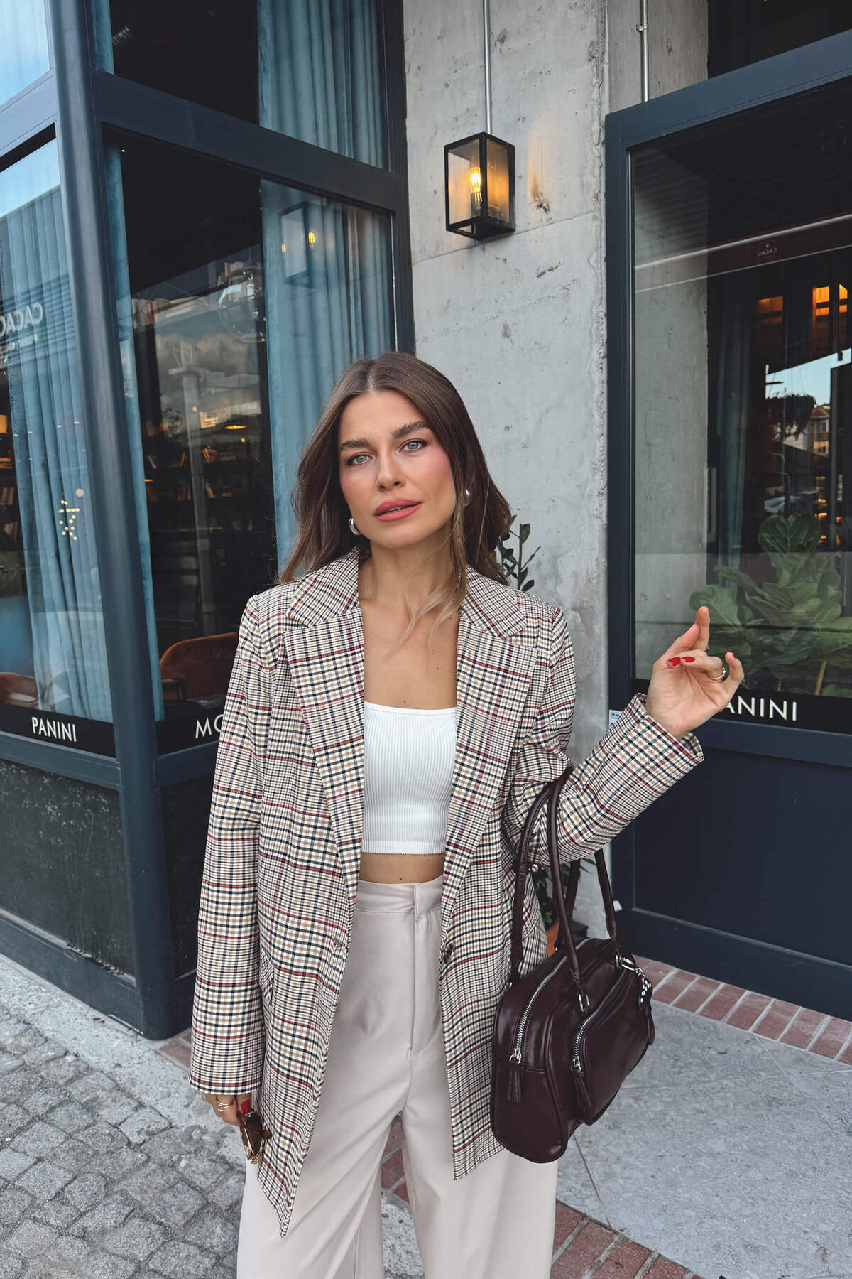 ميزات سترة مبطنة منقوشة باللون البيج والأحمر من Sue Store