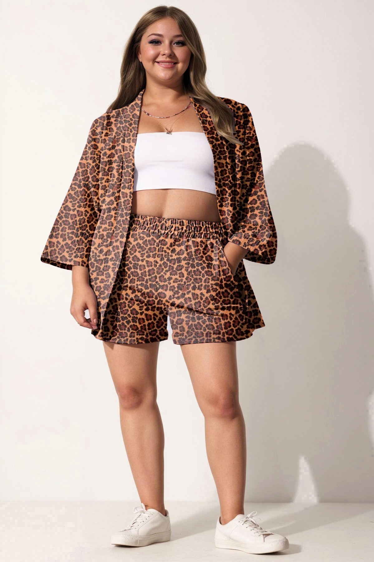SUHIS طقم شورت كيمونو محبوك بطبعة جلد الفهد مقاس كبير