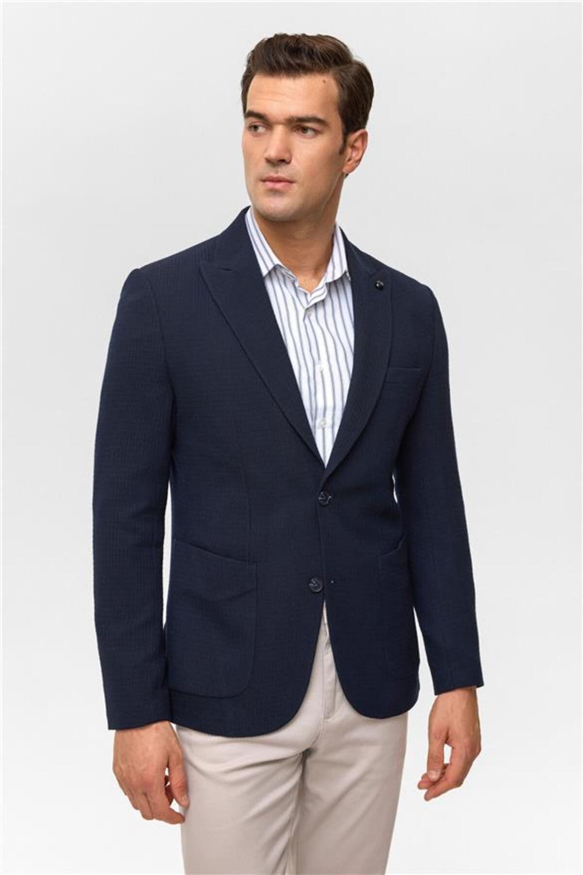 ميزات سترة زرقاء داكنة ضيقة منقوشة بياقة واحدة وستة أزرار من SÜVARİ