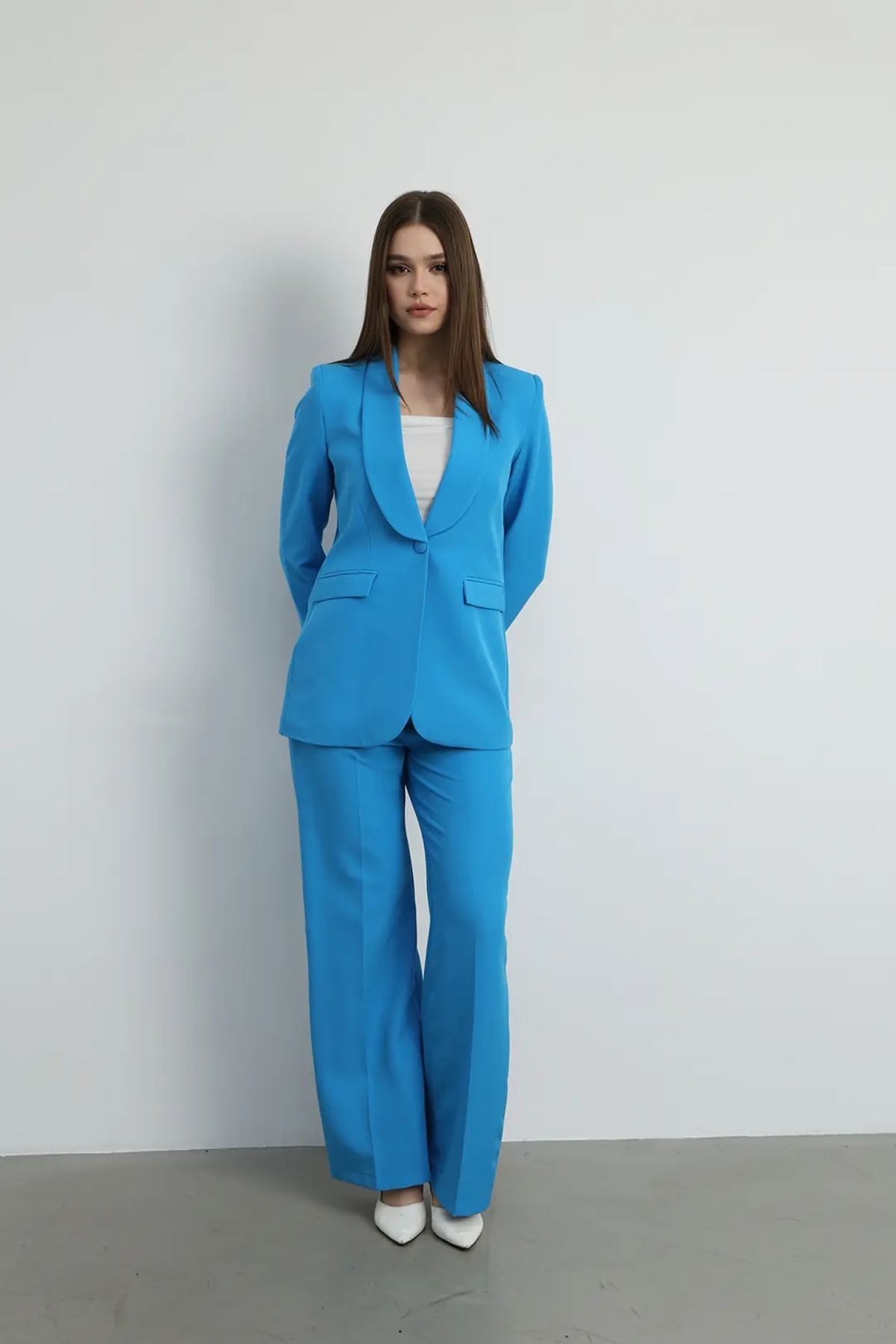 ميزات طقم سترة وبنطلون بزر واحد باللون الأزرق الفاتح من Swass