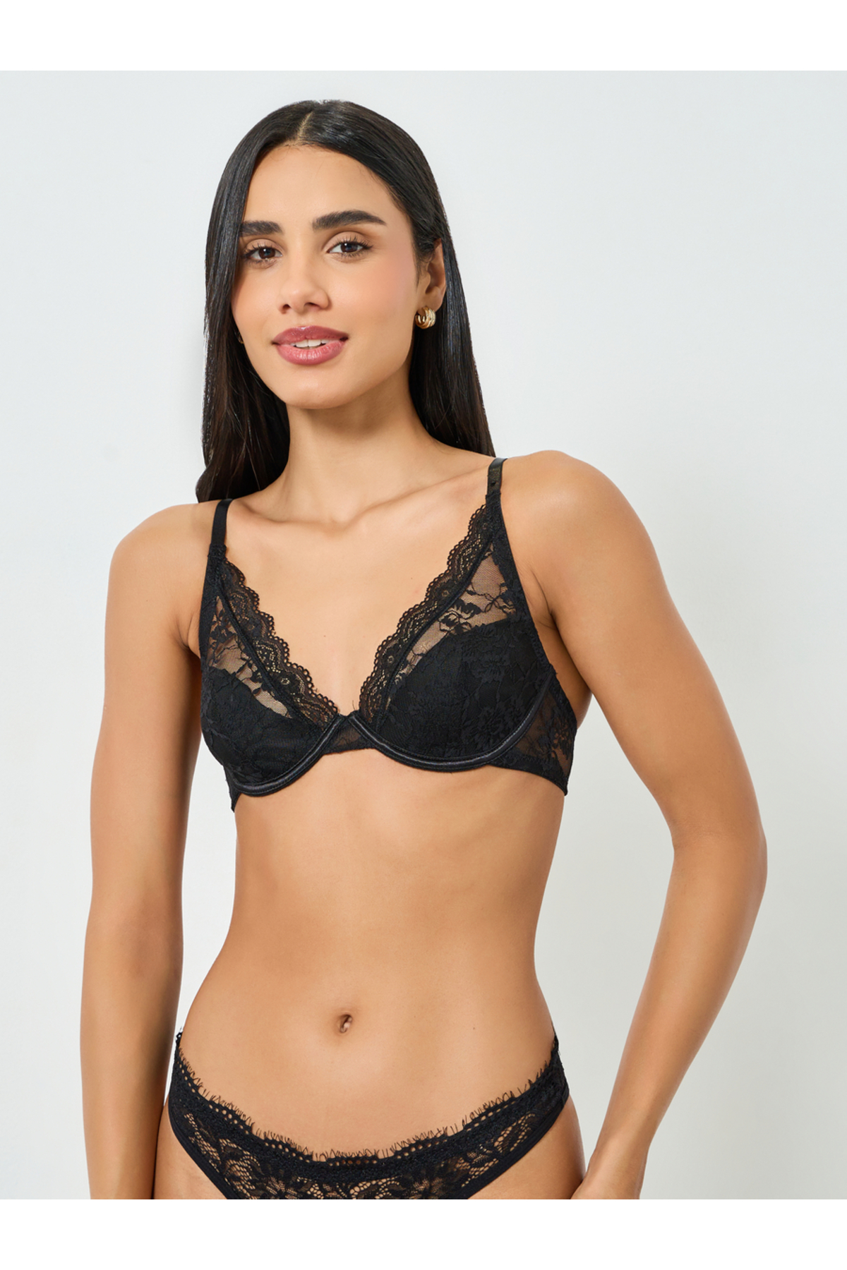 Take Two By Styli حمالة مرقَّع سوداء سادة من دانتيل بأسلاك مبطنة بسلك