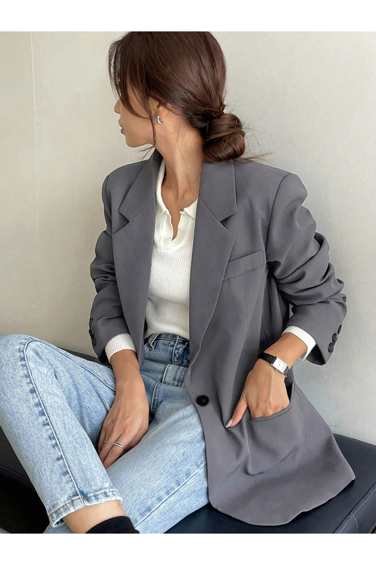 Take Two By Styli سترة رمادية بأزرار مع تفاصيل شق في الخلف