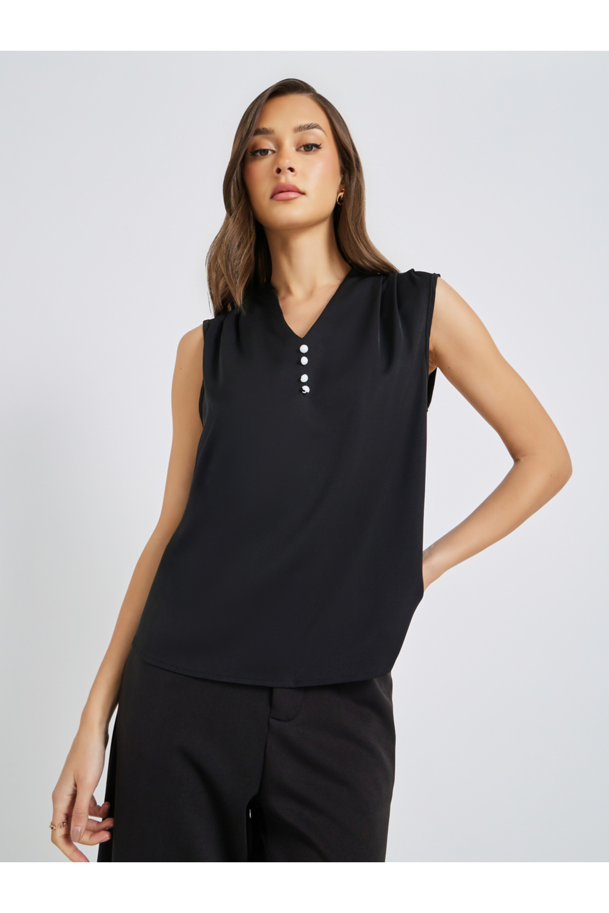 ميزات بلوزة سادة بدون أكمام بأزرار أمامية من Take Two By Styli