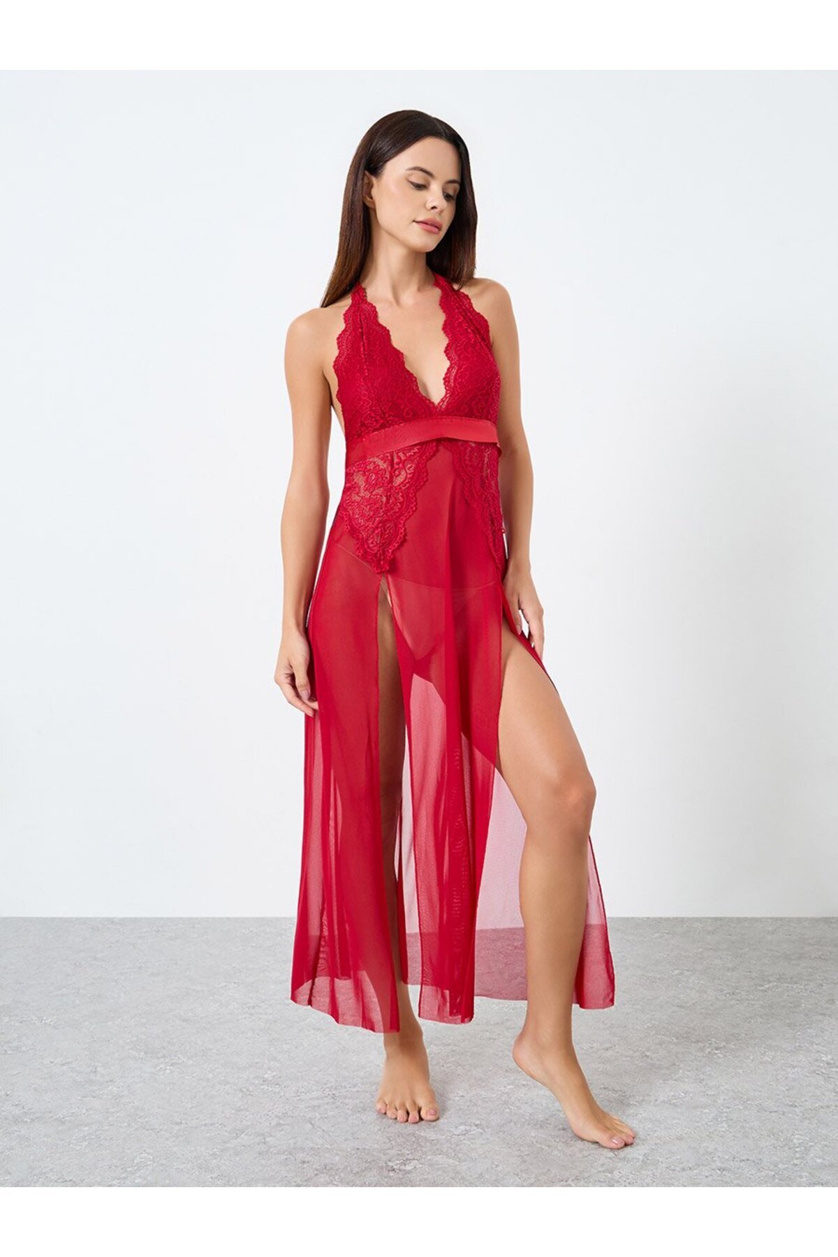 ميزات فستان كامي من قماش شبكي متين، مطرز بالدانتيل، مزود بحزام وحافة مشقوقة من Take Two By Styli