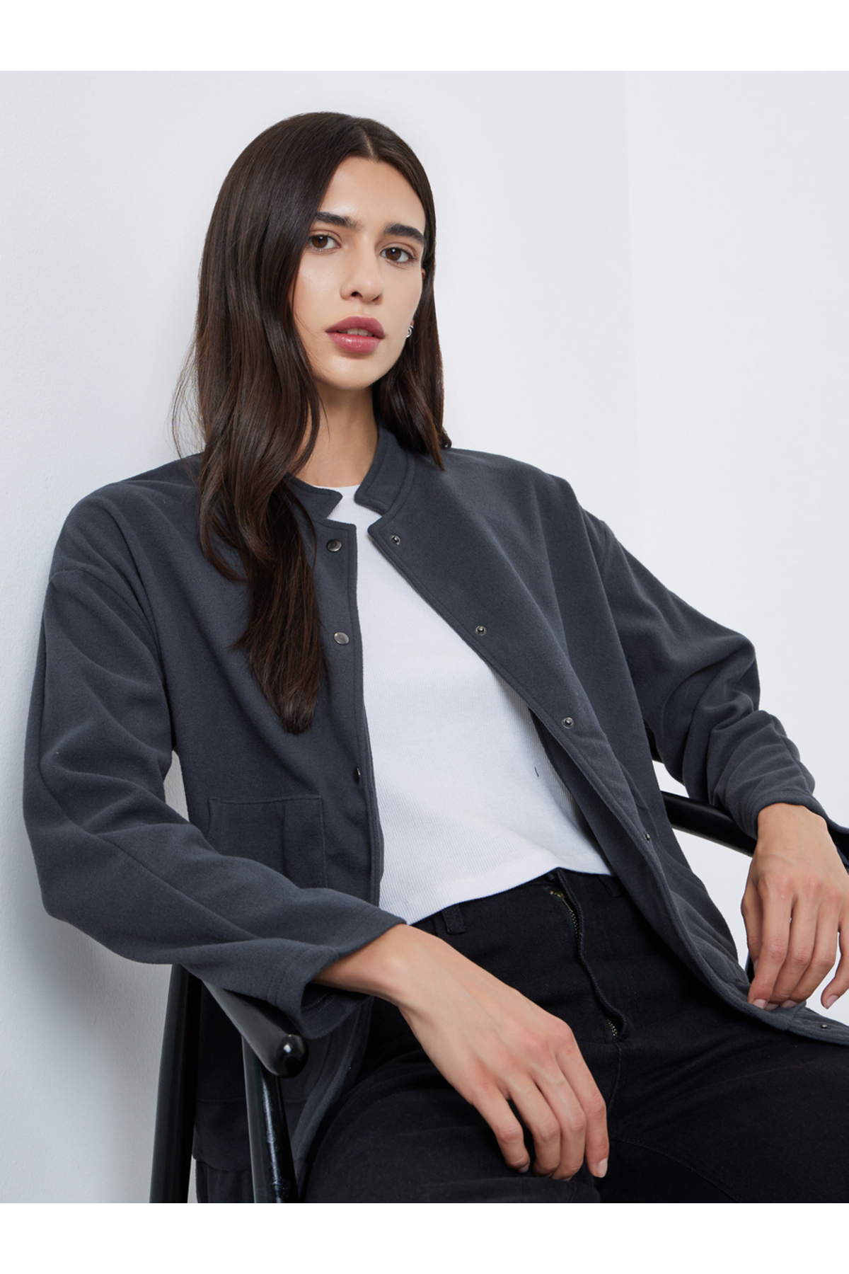 ميزات سترة نسائية رمادية سادة متعددة الاستخدامات من Take Two By Styli