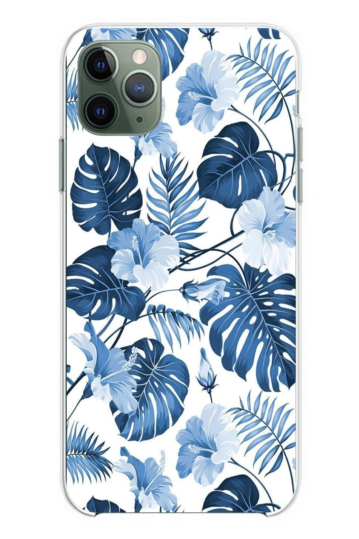 TechTree حافظة سيليكون مطبوع متوافقة مع هاتف iPhone 11 Pro Max بنمط أوراق الشجر الزرقاء والزهور