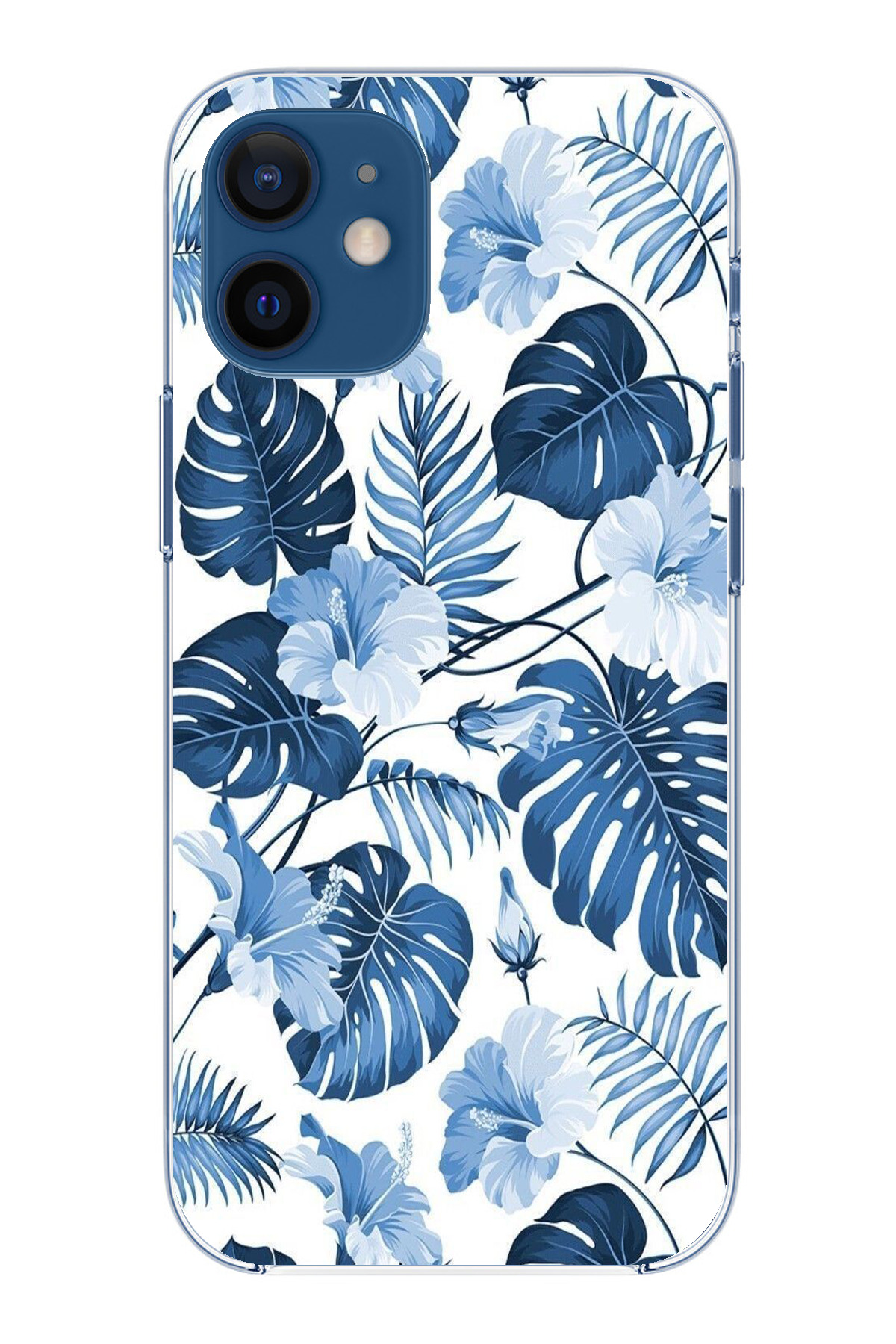 ميزات حافظة سيليكون مطبوع متوافقة مع هاتف iPhone 12 Mini بنمط أوراق الشجر الزرقاء والزهور من TechTree
