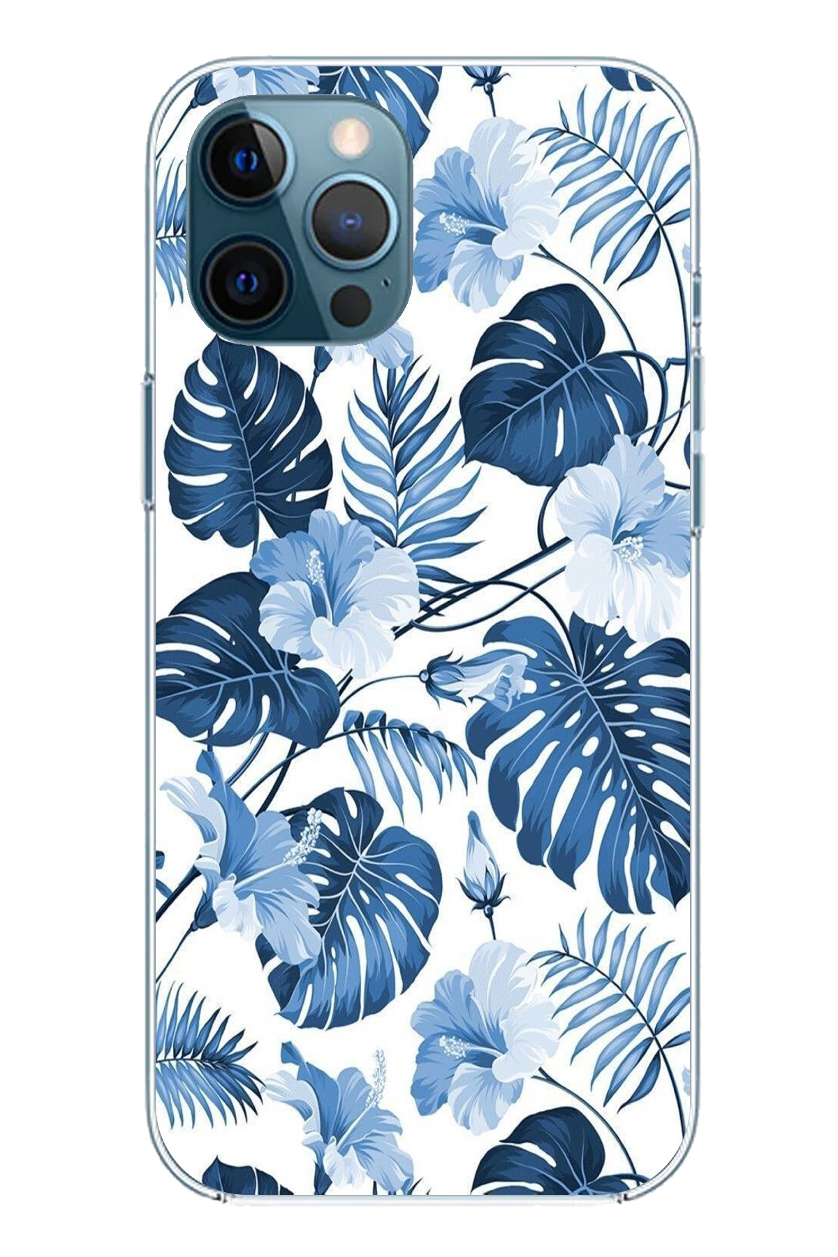 TechTree حافظة سيليكون مطبوع متوافقة مع هاتف iPhone 12 PRO MAX بنمط أوراق الشجر الزرقاء والزهور