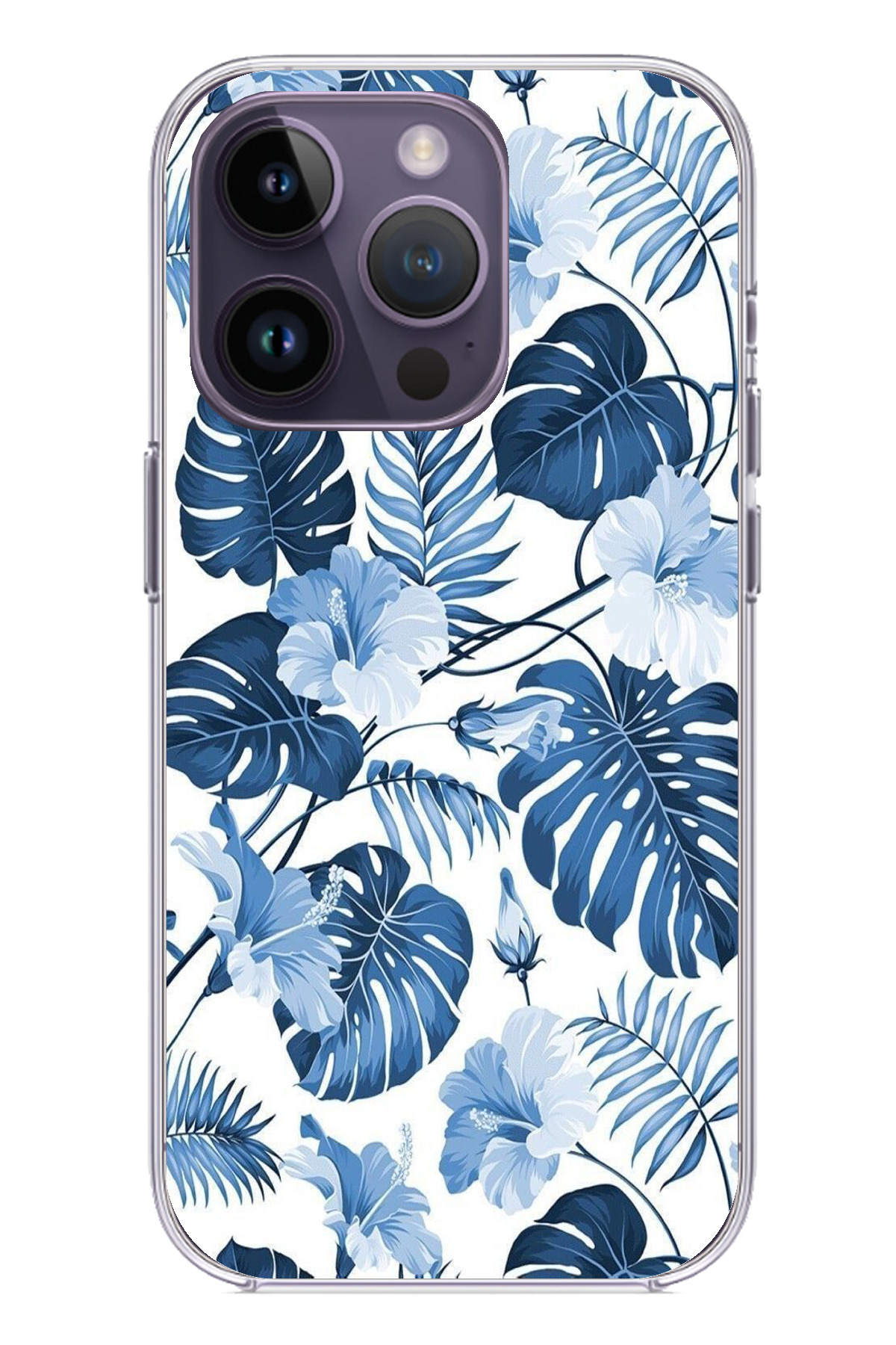 ميزات حافظة سيليكون مطبوع متوافقة مع هاتف iPhone 14 PRO MAX بنمط أوراق الشجر الزرقاء والزهور من TechTree