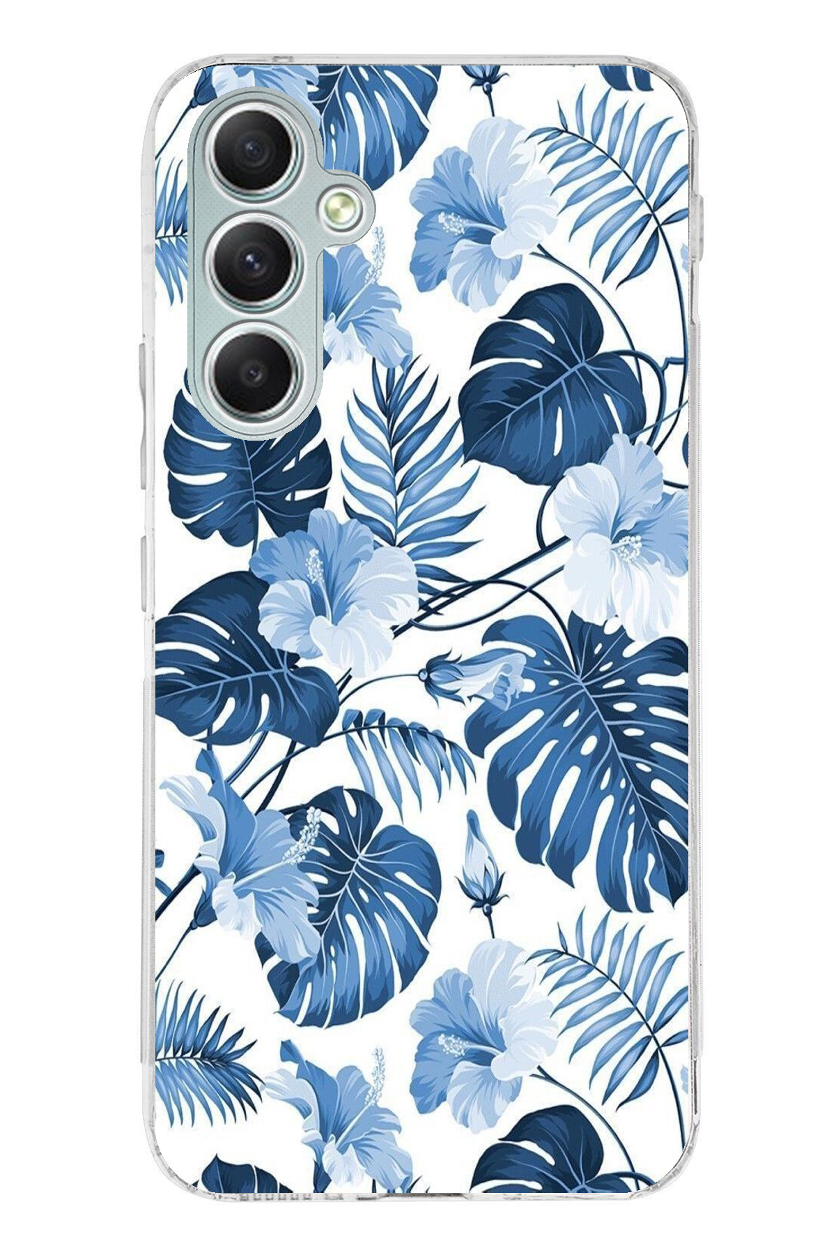 ميزات حافظة سيليكون مطبوع متوافقة مع هاتف سامسونج جالاكسي A34 بنمط أوراق الشجر الزرقاء والزهور من TechTree