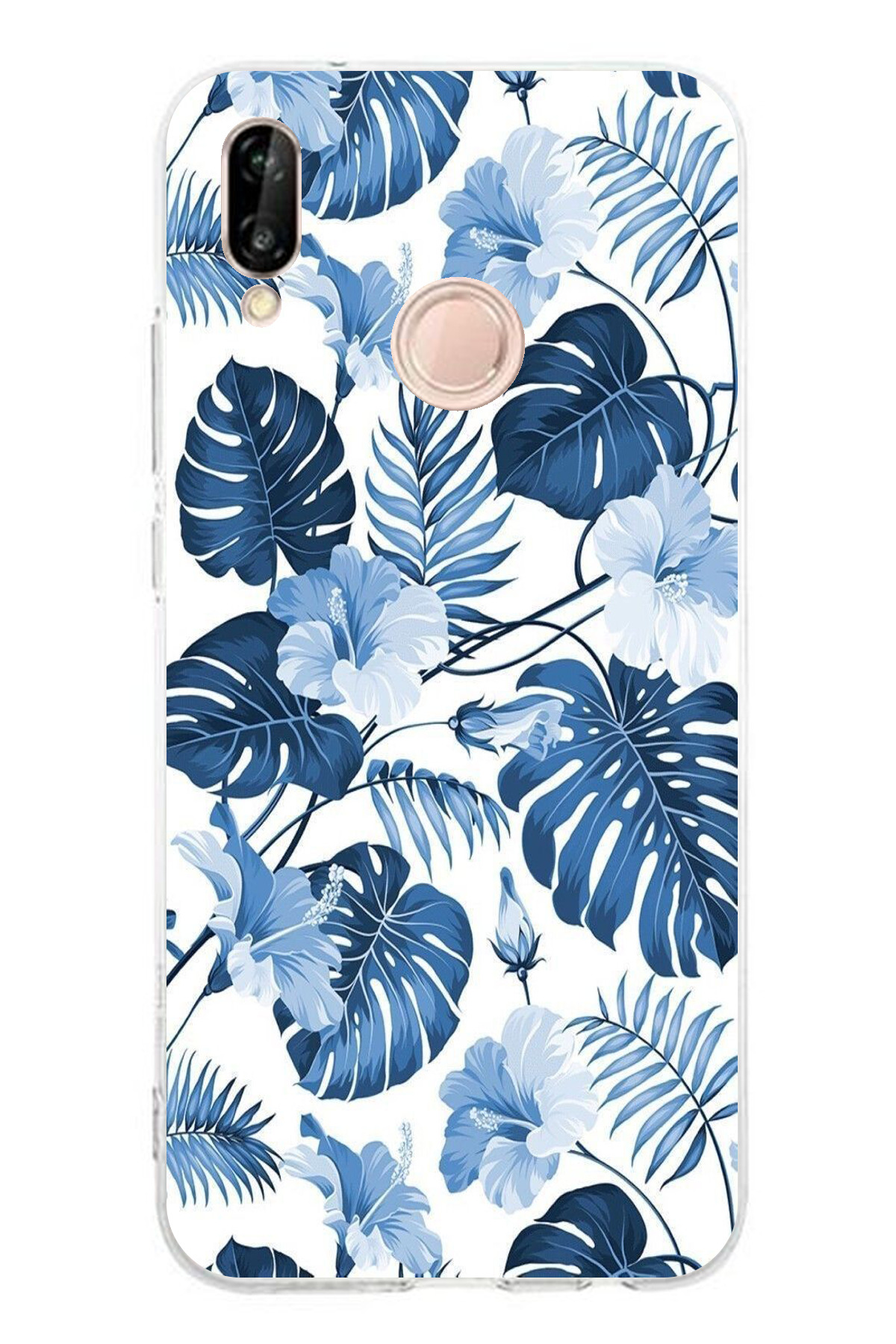 ميزات حافظة سيليكون مطبوع متوافقة مع هاتف هواوي P20 لايت بنمط أوراق الشجر الزرقاء والزهور من TechTree