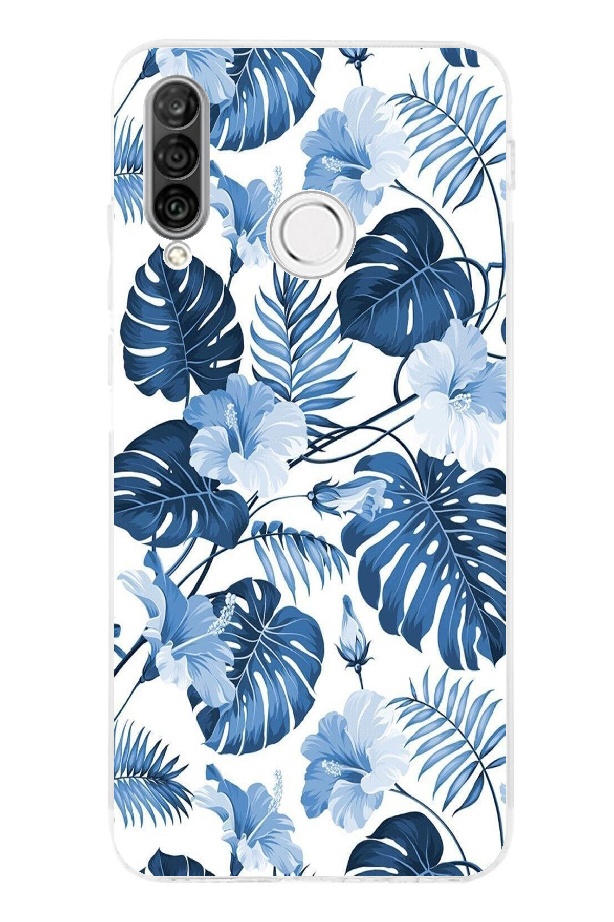 ميزات حافظة سيليكون مطبوع متوافقة مع هاتف هواوي P30 لايت بنمط أوراق الشجر الزرقاء والزهور من TechTree