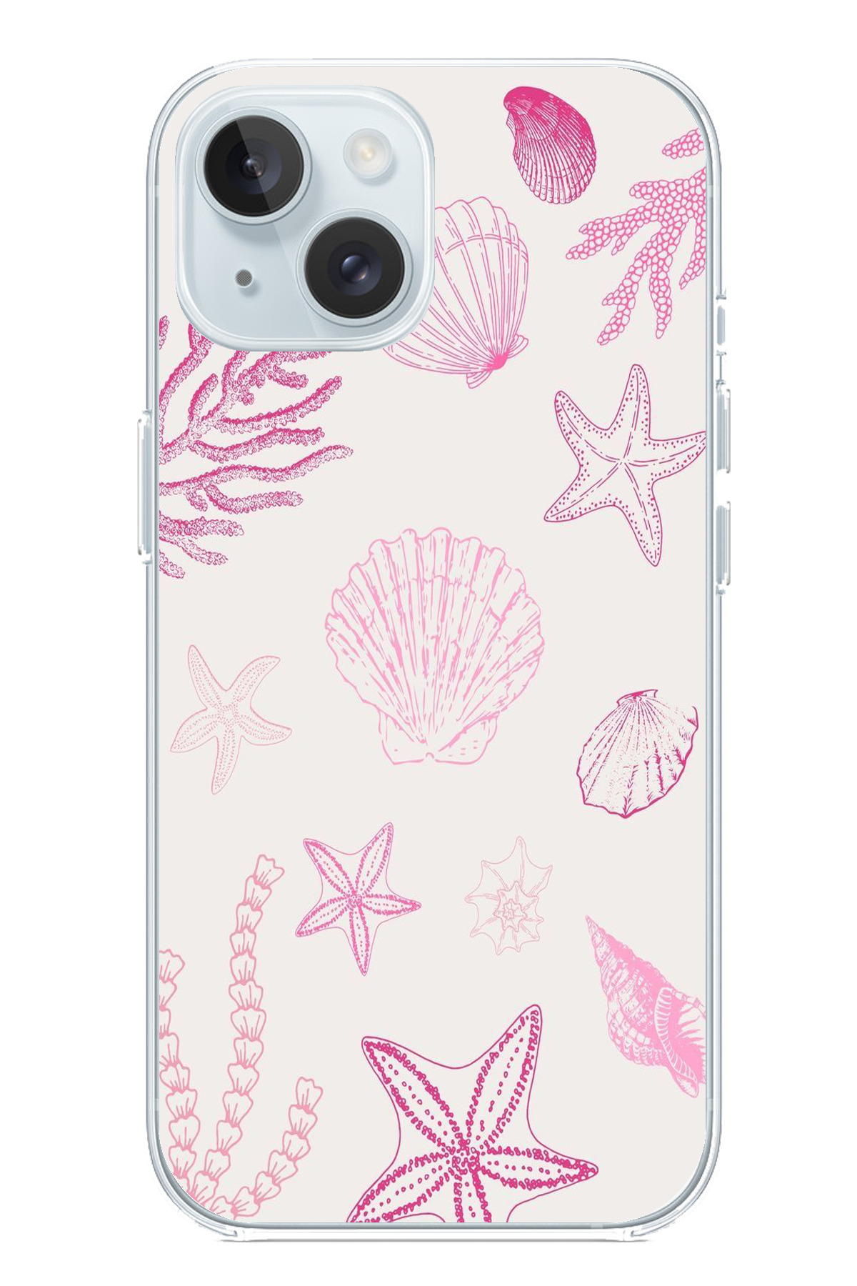 ميزات حافظة سيليكون متوافقة مع هاتف iPhone 15 باللون الوردي وStarfish and Shell مطبوع من TechTree