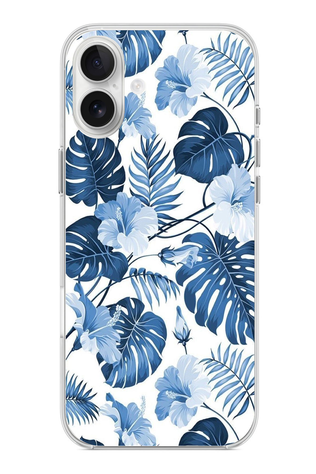 ميزات حافظة سيليكون مطبوع متوافقة مع هاتف iPhone 16 PLUS بنمط أوراق الشجر الزرقاء والزهور من TechTree