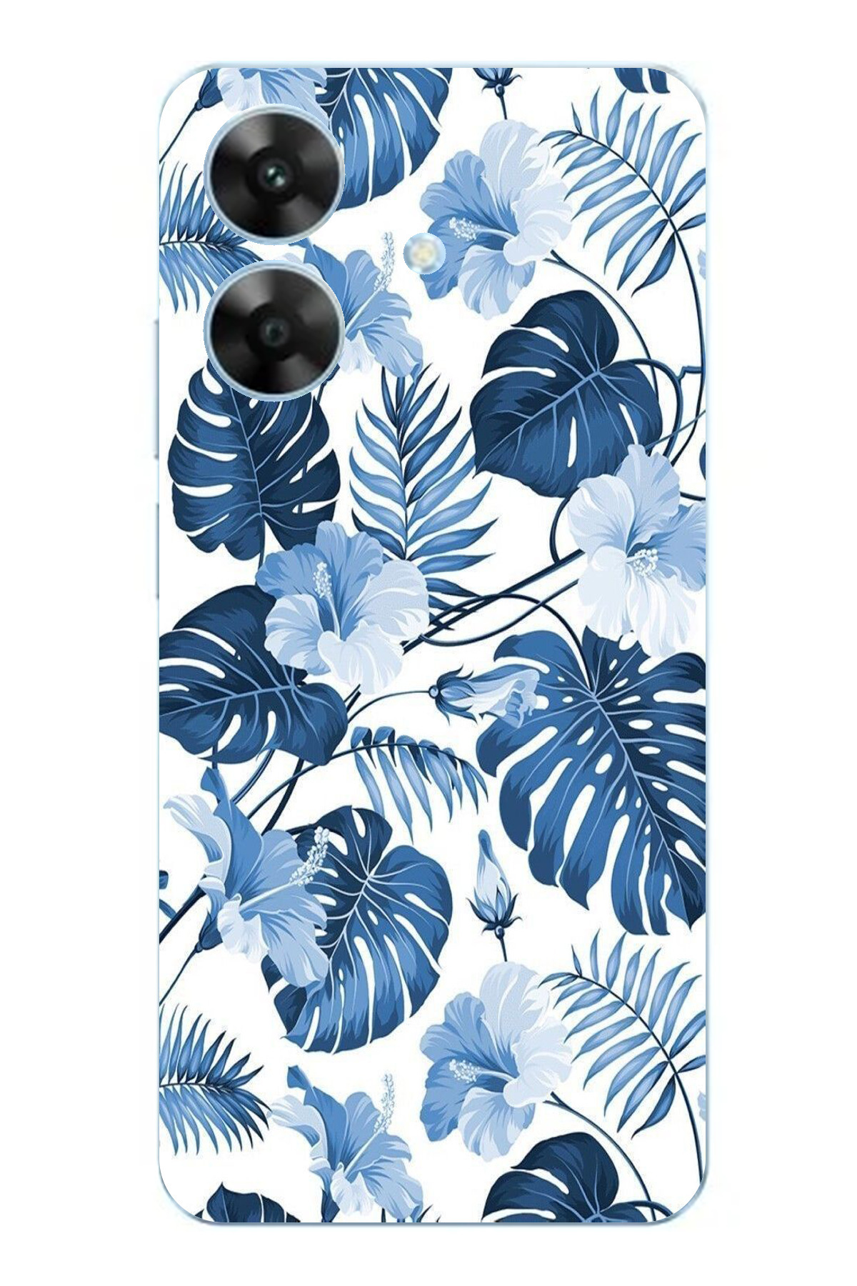 ميزات حافظة سيليكون مطبوع متوافقة مع هاتف Realme Note 60 بنمط أوراق الشجر الزرقاء والزهور من TechTree