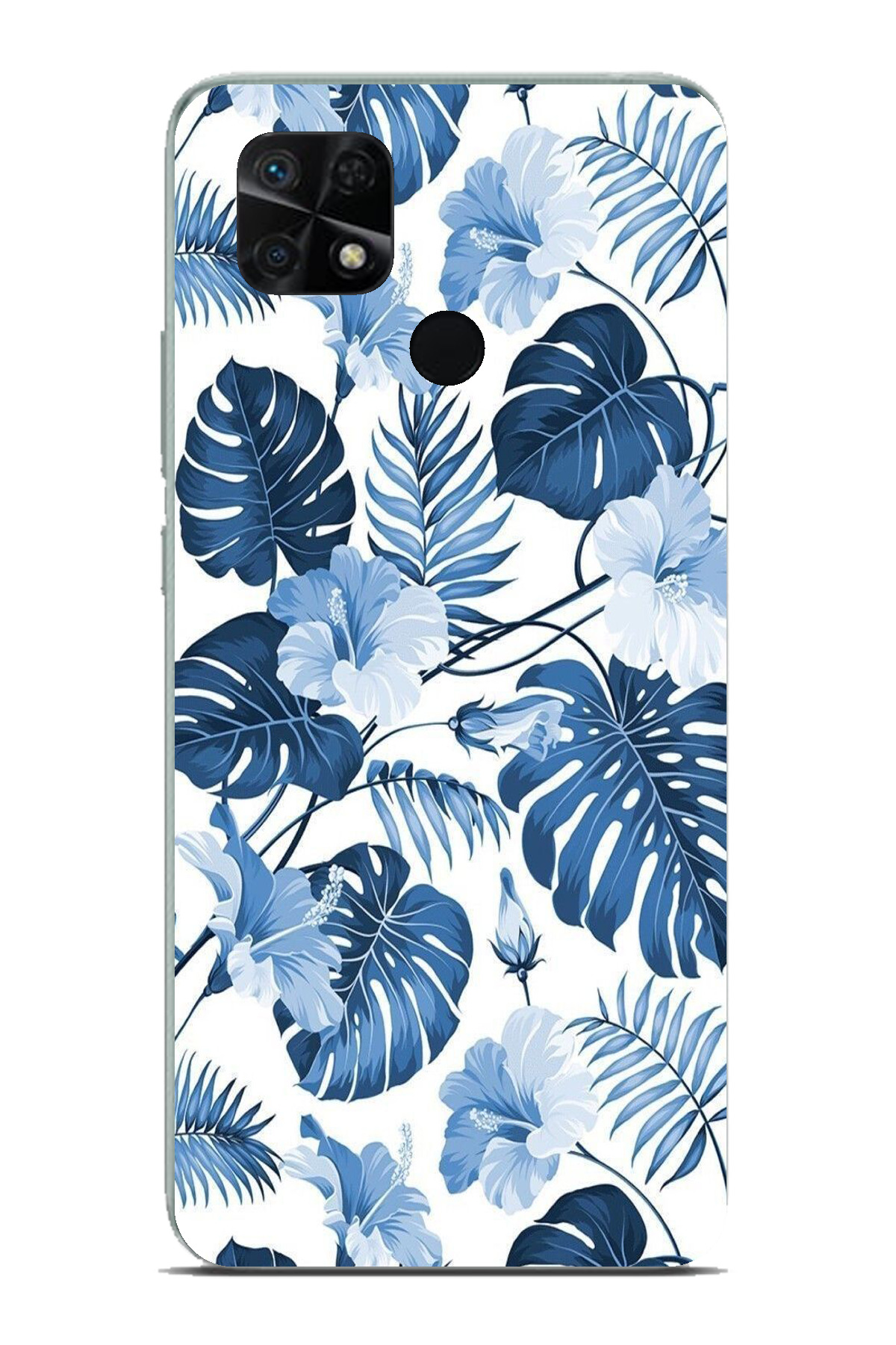 ميزات حافظة سيليكون مطبوع متوافقة مع هاتف Redmi 10C - POCO C40 بنمط أوراق الشجر الزرقاء والزهور من TechTree