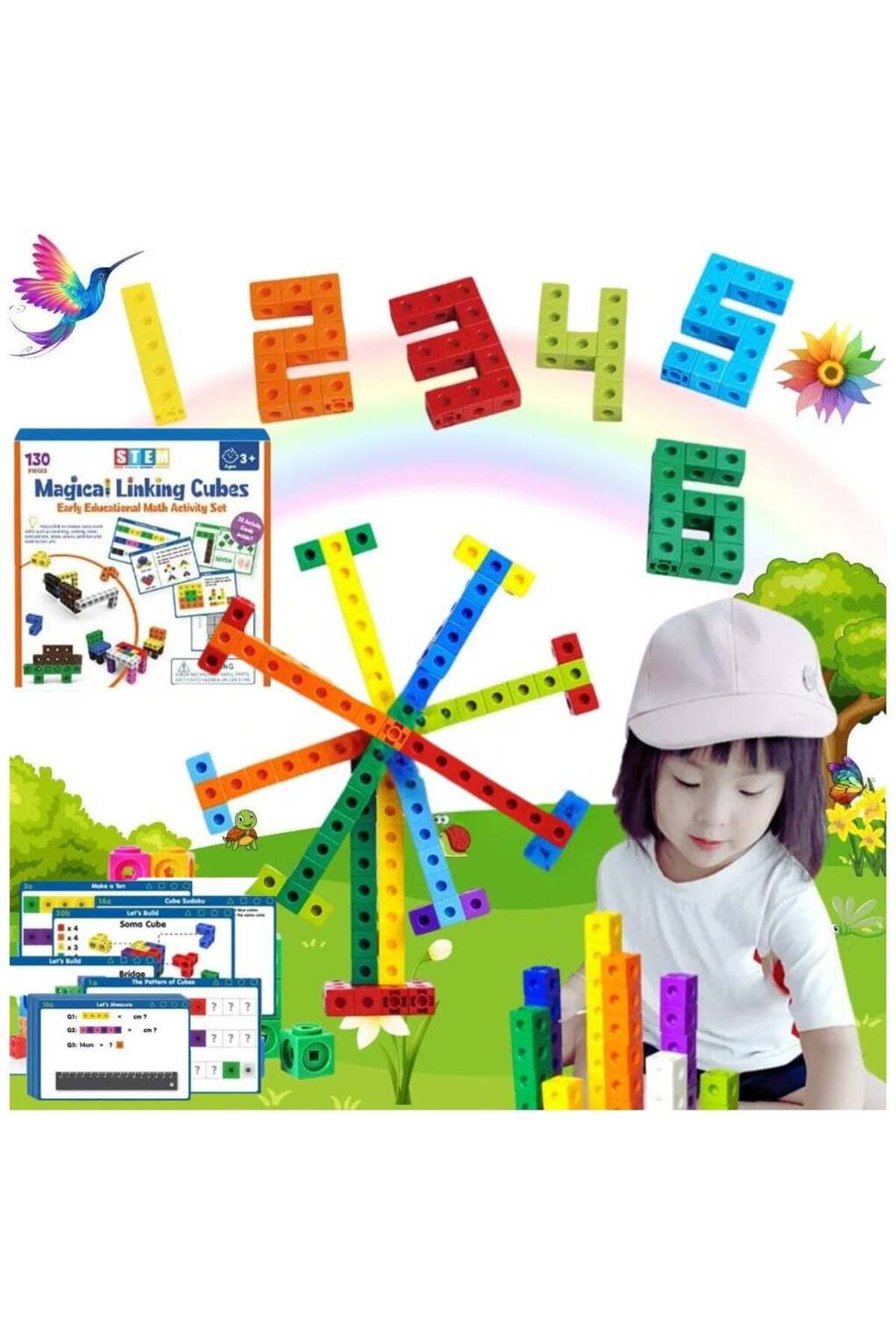 TEGRILO 130 قطعة من مكعبات الربط الرياضية وبطاقات الأنشطة الرياضية، مكعبات رياضية للتلاعب، عداد رياضيات لتوصيل المكعبات