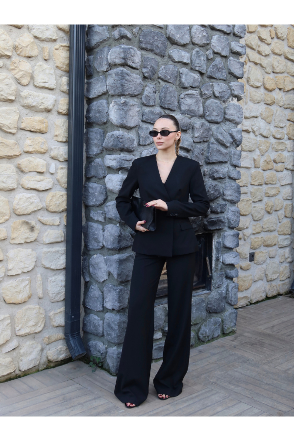 ميزات طقم سترة وبنطلون بياقة على شكل حرف V من thelowely