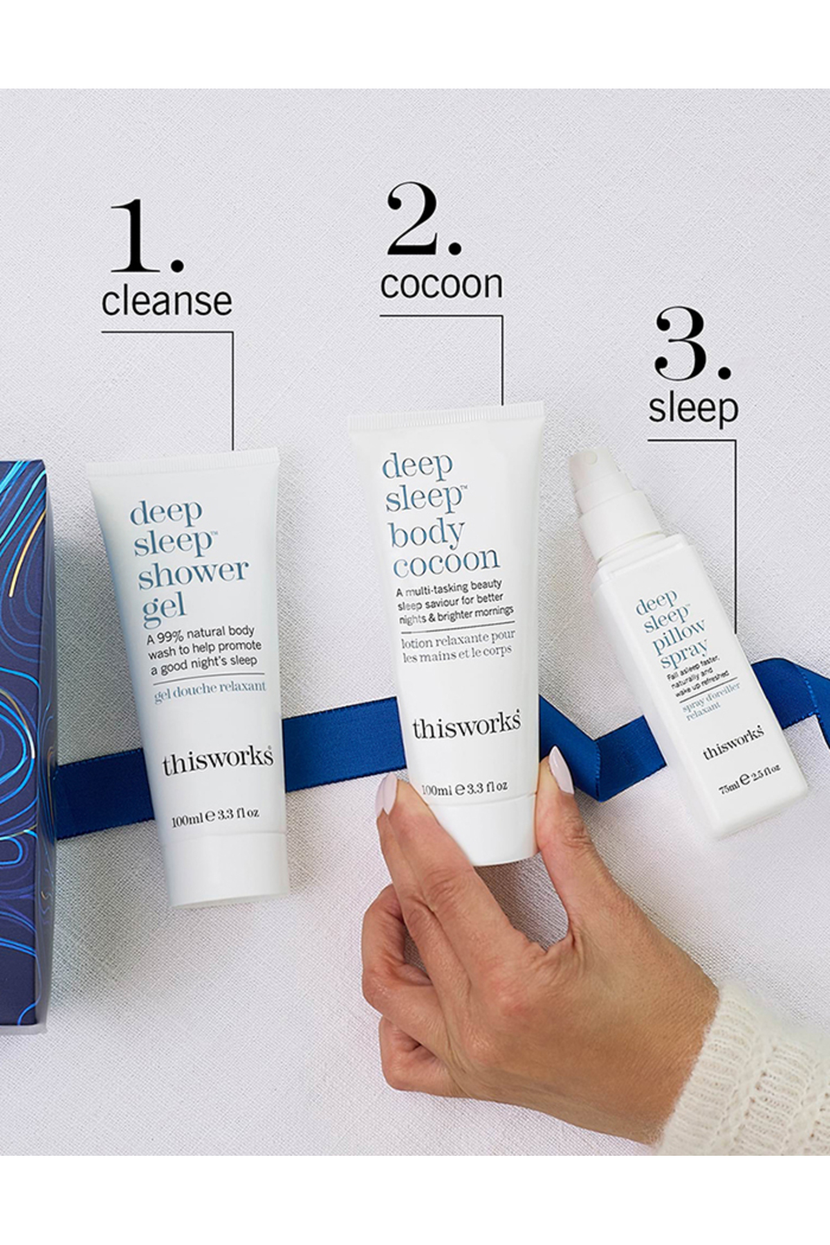 The Deep Sleep Functional Fragrance combines 100% natural essential oils of Lavender, Vetivert and Camomile to relax your body into restful sleep. Start with a shower or bath, over an hour before bed, to soothe skin with deep sleep shower gel then, once dry, massage deep sleep body cocoon with Shea Butter, Crambe, Camelia and Sativa Oils for ultra-moisturising effects on the skin. End with deep sleep pillow spray, proven to help you fall asleep faster. This set contains: 1 x deep sleep pillow spray 75ml, 1 x deep sleep shower gel 100ml, 1 x deep sleep body cocoon 100ml.
