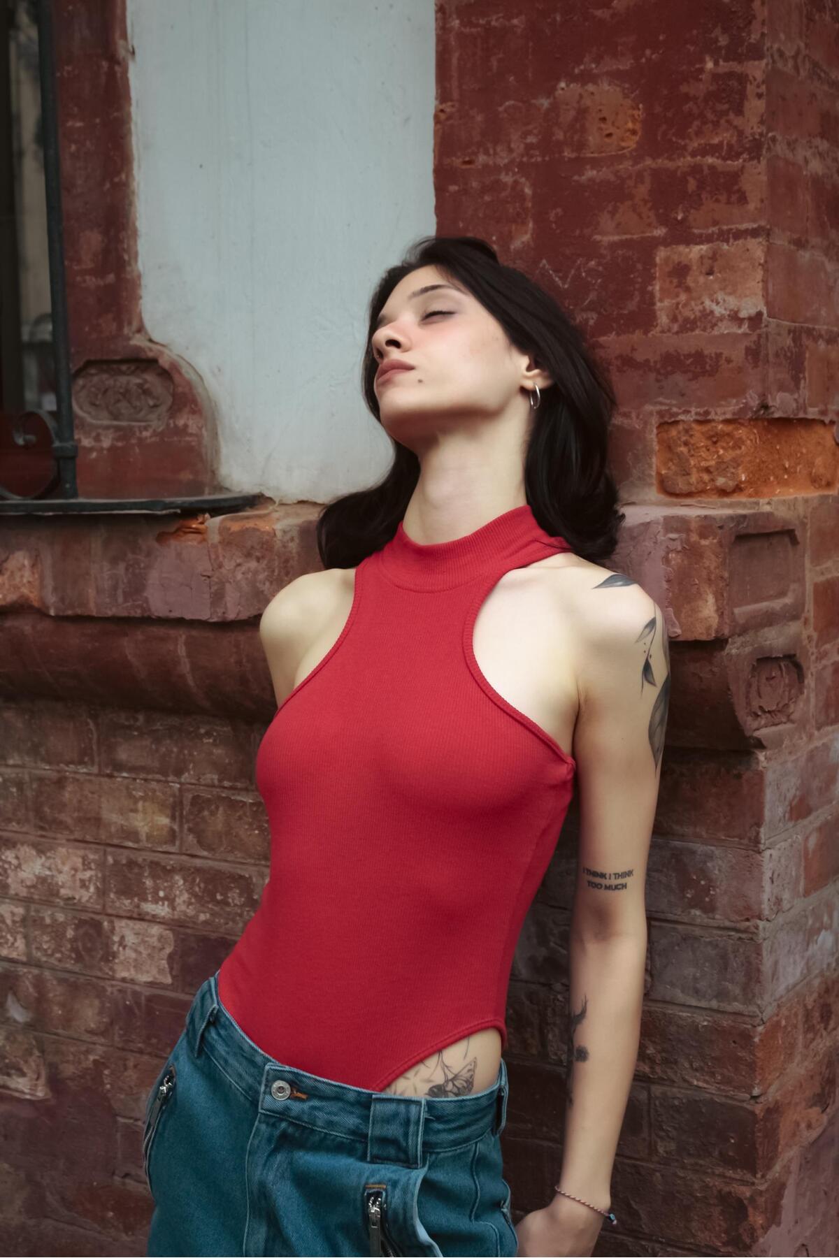 Touz Moda بلوزة قصيرة ذات تفاصيل أساسية باللون الأحمر